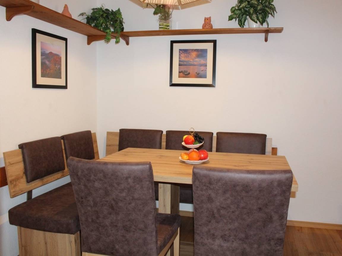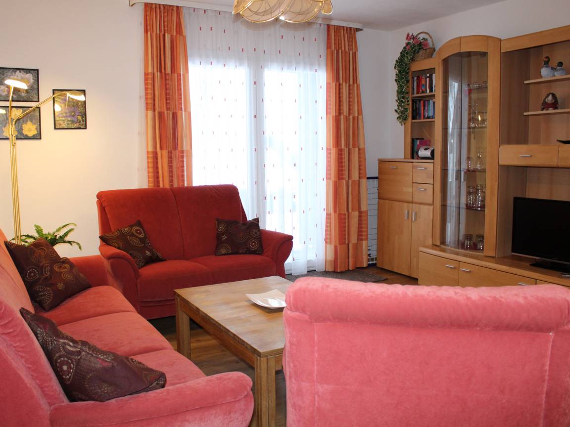 Unser liebevoll eingerichtetes Wohnzimmer mit integrierter Eßecke ist ausgestattet mit einer neuen Sitzgruppe, bestehend aus einer 3-Sitzer und einer 2-Sitzer-Couch, sowie einem bequemen Einzelsessel, neuer Schrankwand mit Fernseher, CD-Radio und Telefon.