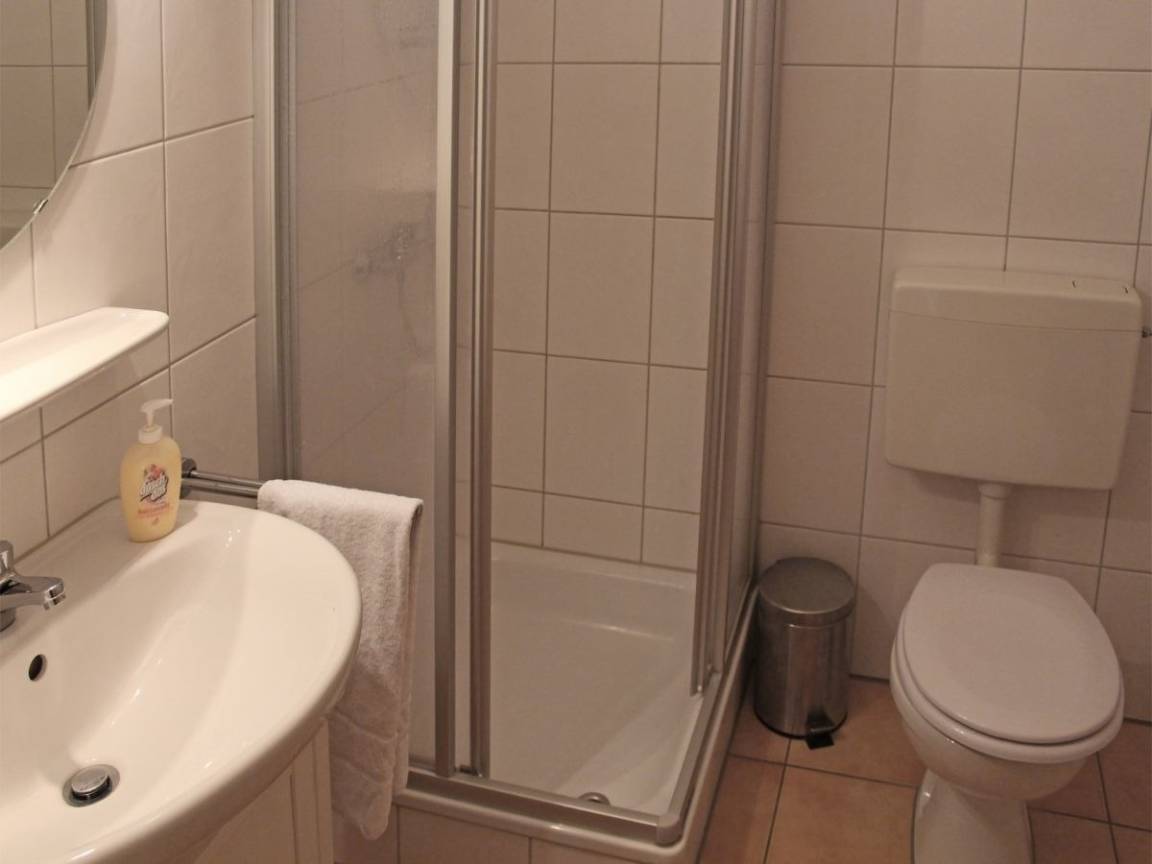 1 helles und freundliches Duschbad mit großer Dusche und flachem Wanneneinstieg, WC, Waschbecken, Handtuchwärmer.