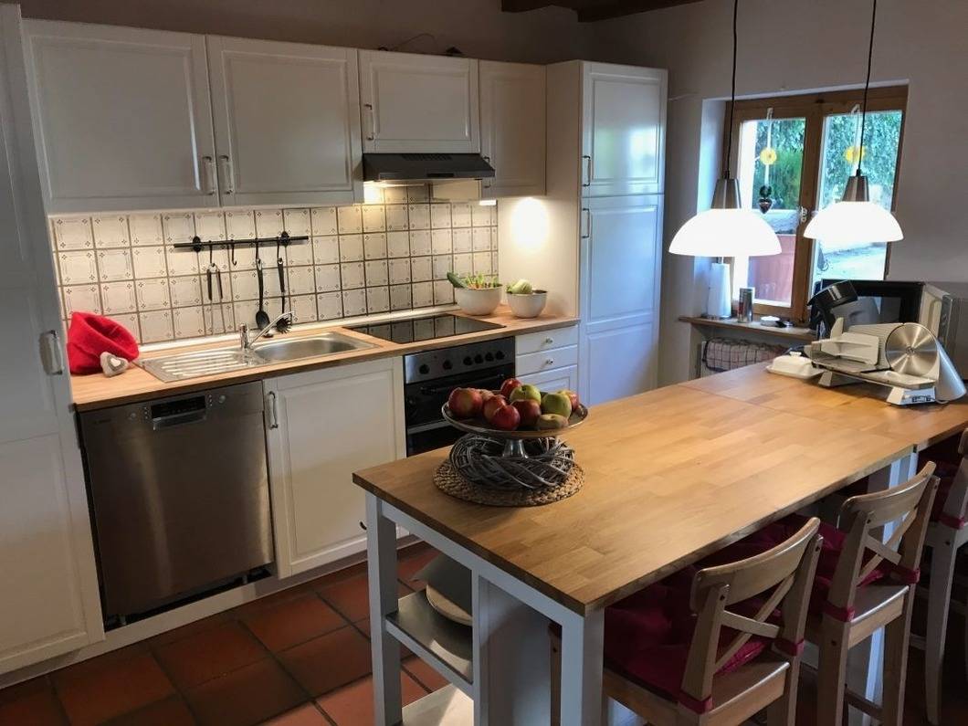 In der Küche ist neben einem Herd mit Backofen ein großer Kühlschrank mit Gefrierfach vorhanden. Auch ein Geschirrspüler und eine Mikrowelle gehören zur Ausstattung der Küche.