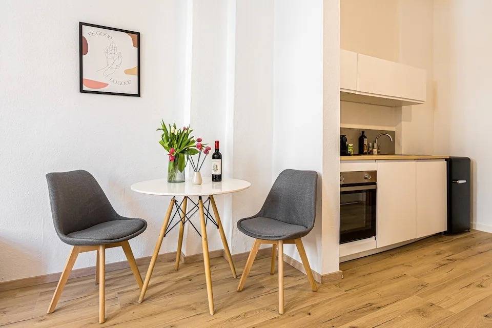 Das Apartment ist stilvoll eingerichtet und verfügt über ein gemütliches Schlafzimmer mit einem komfortablen Doppelbett und einem Schlafsofa sowie einer helle Küche mit Esstisch, die auch für ein Home-Office geeignet ist. Die moderne Küche ist komplett mit allem ausgestattet, was man braucht, um seine Mahlzeiten zuzubereiten. Das Bad ist neu und verfügt über eine Dusche.