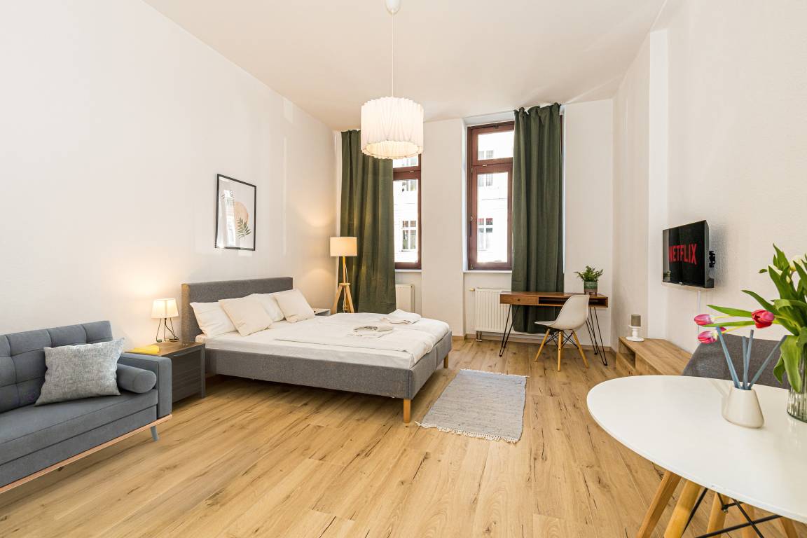 Unser Apartment bietet dir alles, was du für einen angenehmen Aufenthalt brauchst. Es befindet sich in einem charmanten alten Gebäude und verfügt über große Fenster, die viel natürliches Licht hereinlassen und eine wunderbare Aussicht bieten. Die Wohnung befindet sich auch in erstklassiger Lage: Der Markt - das Herz und die historische Altstadt von Leipzig - ist nur 25 Gehminuten entfernt (15 Minuten mit den öffentlichen Verkehrsmitteln).