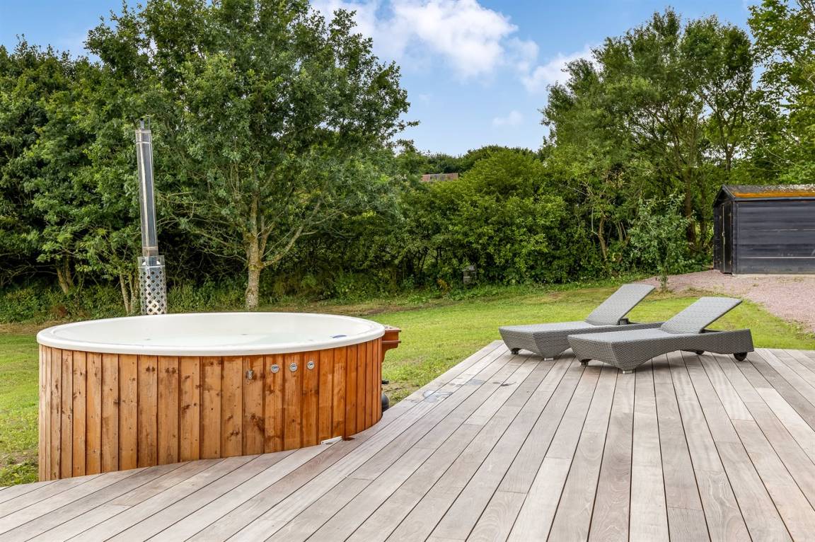 Genieße das warme Wasser im Hot-Tub und die hügelige Landschaft von Gjellerodde.
