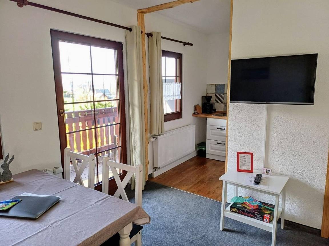 Ein-Raum-FeWo mit offener Küche, Essecke, Schreibtisch und Balkon mit schöner Aussicht.