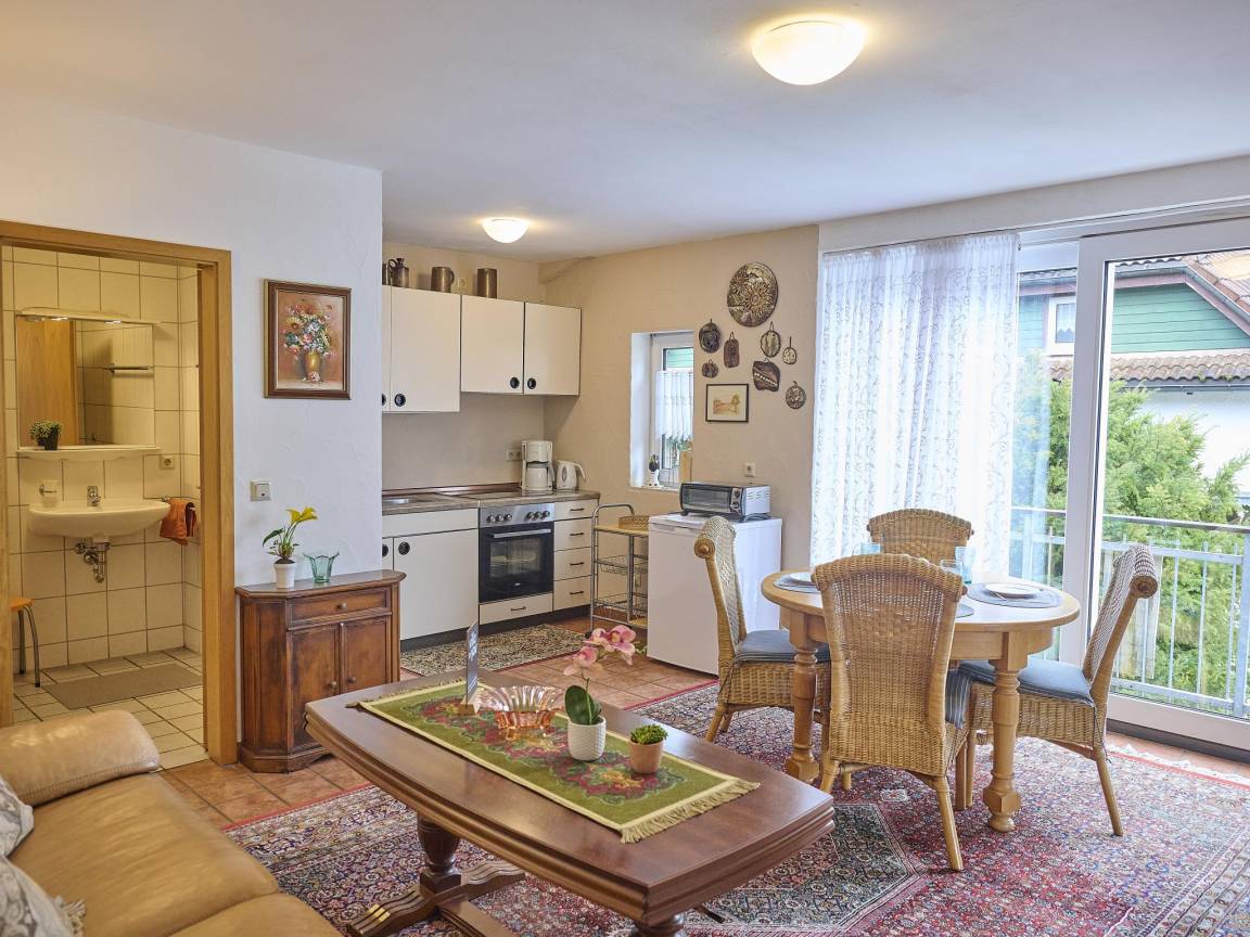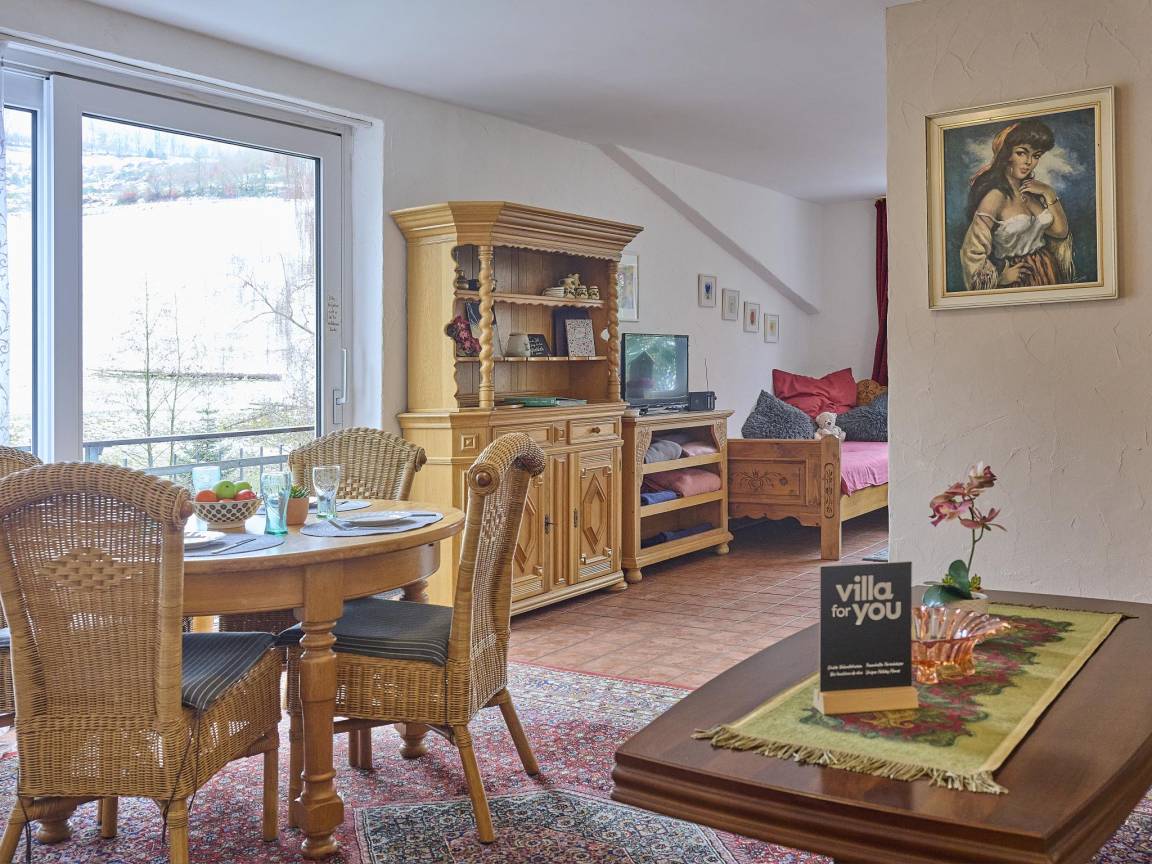 Hausbeschreibung : Diese liebevoll eingerichtete Ferienwohnung liegt in ruhiger Lage in Lennestadt-Bruchhausen im Herzen des Sauerlands. Sie befindet sich im Obergeschoss eines freistehenden Hauses mit zwei Wohneinheiten. Der offen gestaltete Wohn-, Schlaf- und Küchenbereich ist gemütlich und voll ausgestattet – ideal für entspannte Urlaubstage. Ein gepflegter Garten steht zur gemeinschaftlichen Nutzung zur Verfügung. Am Wochenende verwöhnt das kleine Hofcafé mit hausgemachten Torten