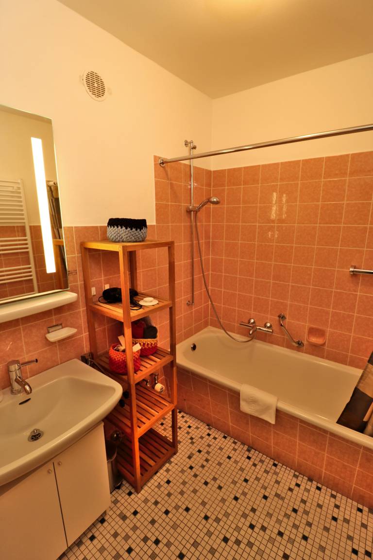 Im Bad befindet sich eine Badewanne mit Duschmöglichkeit.