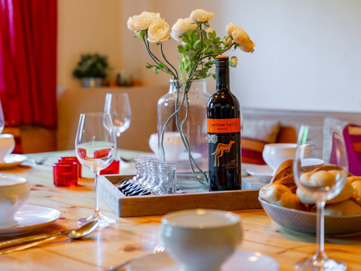 Layout : Parterre: Eingang, Wohnküche mit Ofen(Kachel), Wasserkocher, Kochherd(elektrisch), Dunstabzugshaube, Kaffeemaschine(Filter, nespresso cups), Backofen, Airfryer, Mikrowelle, Geschirrspüler, Kühl-/Gefrierkombination , Wohn/Esszimmer mit TV(Satellit), Esstisch(8 Personen), Ofen(Kachel), Sitzecke(5 Personen) , Toilette