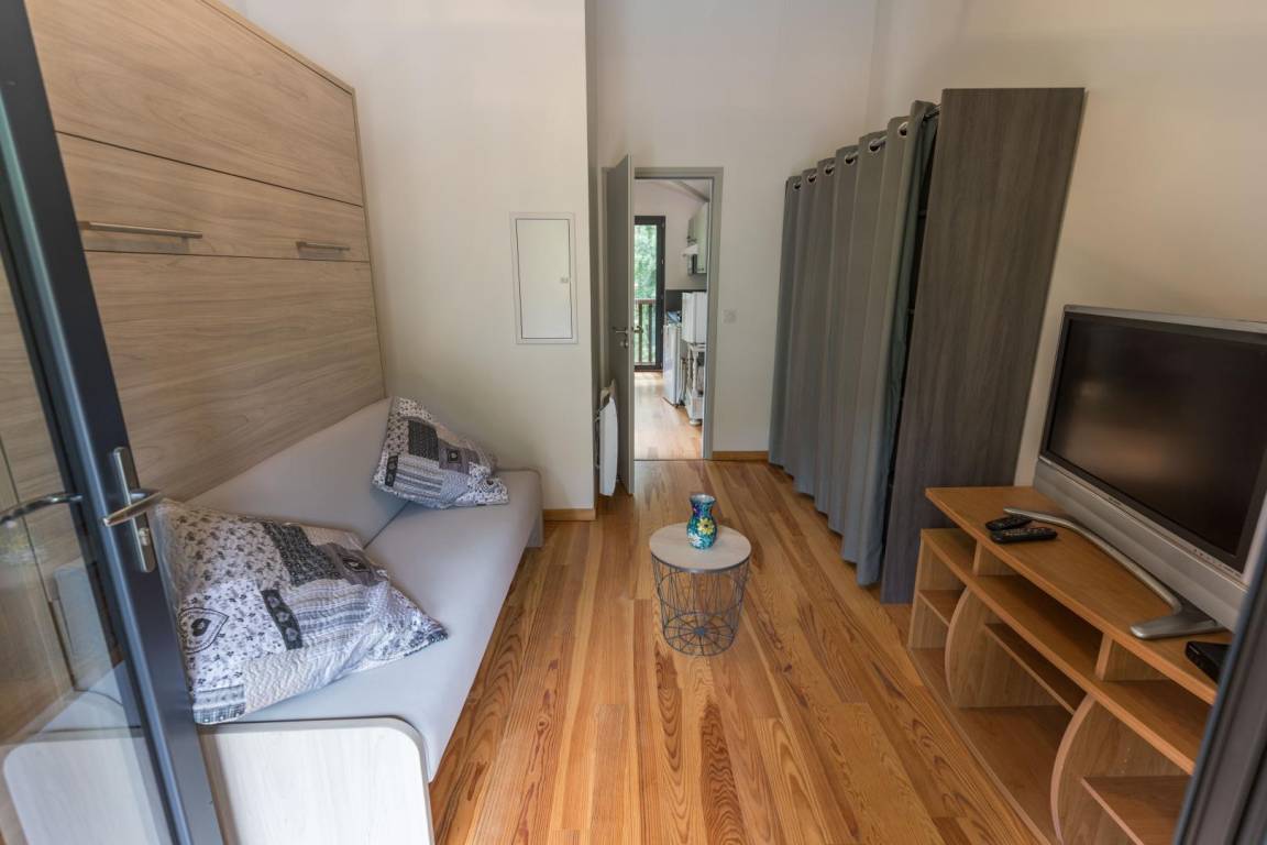 Ett lässt sich in ein Wohnzimmer verwandeln. Davor befindet sich ein echtes Sofa, das sich mit einer einzigen Bewegung ausklappen lässt (Fernseher).
