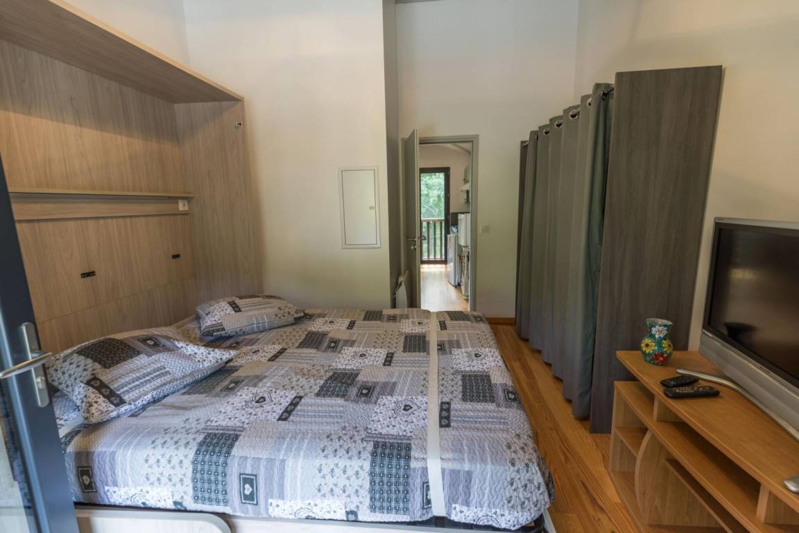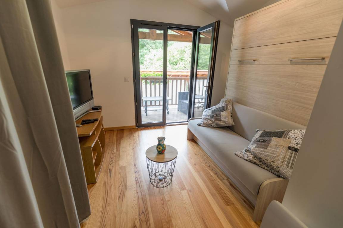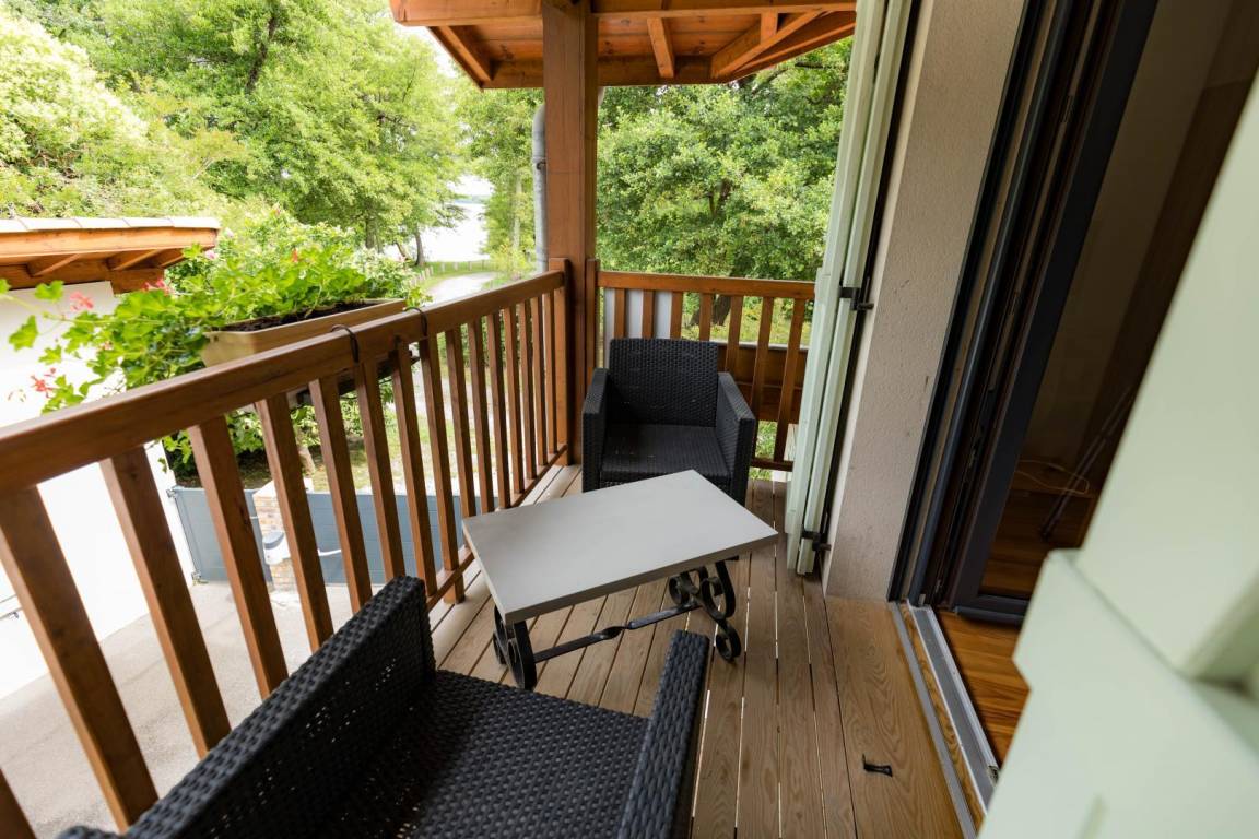 - 2 Schlafzimmer (eines mit einem 160 cm breiten Schrankbett und einem kleinen Balkon mit Loungemöbeln und Seeblick), das andere mit zwei 80 cm breiten Betten)