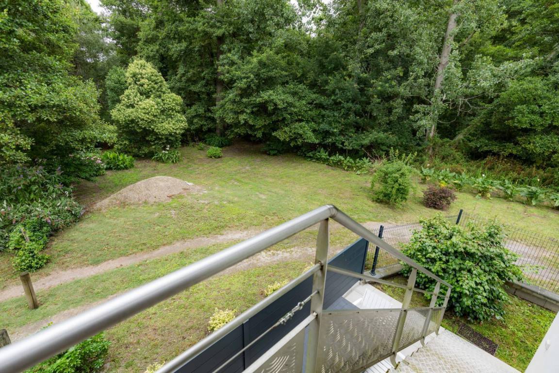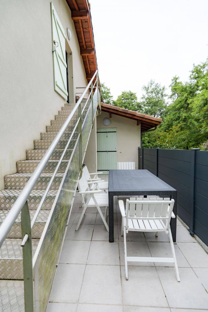 Unter der Treppe befindet sich eine ebenerdige Terrasse mit Gartenmöbeln und Elektrogrill.
