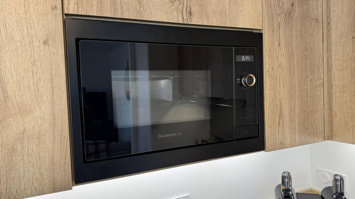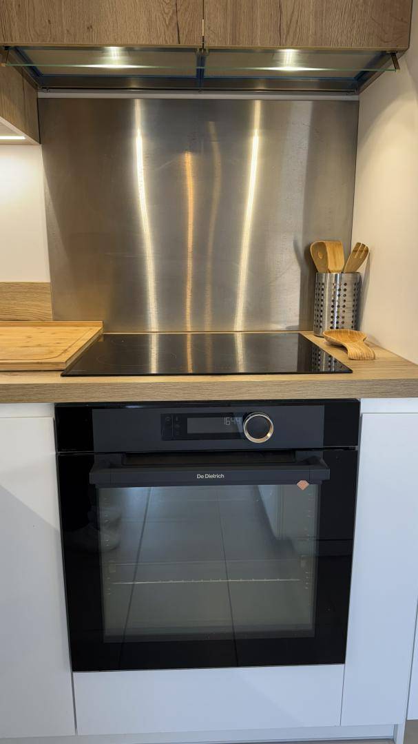 - einem großen Wohnzimmer mit Sitzecke (TV, WLAN), Esszimmer und offener Küche mit Kochinsel (Geschirrspüler, Induktionskochfeld, Elektroherd, Dunstabzugshaube, Mikrowelle, Kühlschrank mit Gefrierfach
