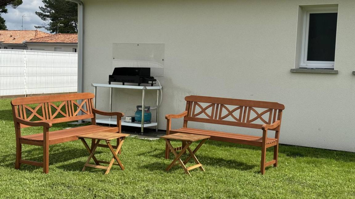 Der 500 m² große, private, eingezäunte Garten bietet eine wunderschöne grüne Umgebung. Zwei Terrassen mit Gartenmöbeln und einem Plancha-Grill laden zum Entspannen und gemütlichen Beisammensein ein.