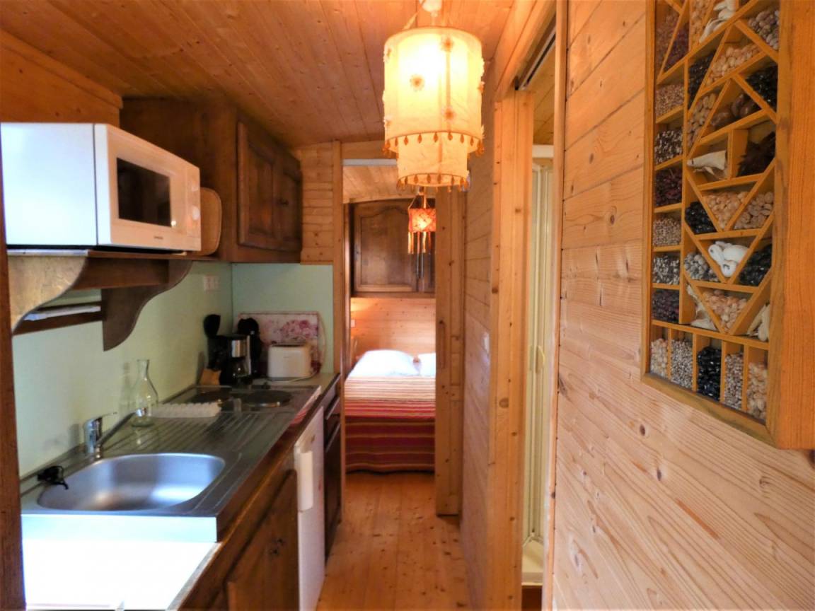 Bohème-Tendenz, Charme und Authentizität dieses Holzwohnwagens, der auf einer Veranda im Herzen der Landeslandschaft steht und die Reiselust wecken wird.