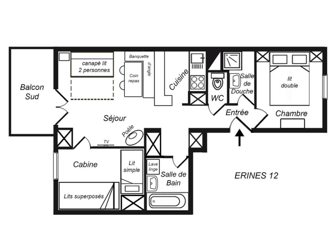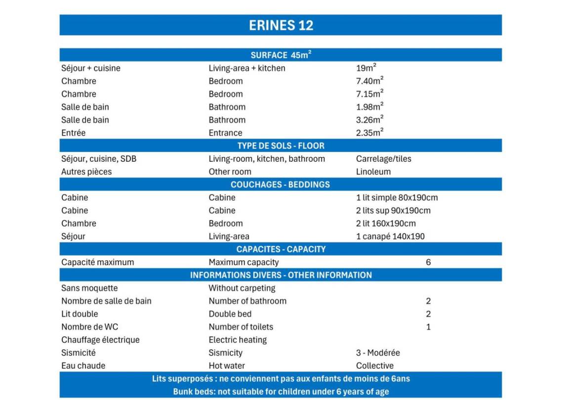 Die Residenz Erines liegt 500 m von den Geschäften entfernt und das Einkaufszentrum Mottaret ist über eine Treppe zwischen den Residenzen zu erreichen. Fläche von ungefähr 45 m². 1te Etage. Orientierung : Süd. Wohnzimmer mit Klappschlafcouch, Schwedenofen. Schlafzimmer mit Doppelbett. offener Schlafbereich mit Einzelbett, 2 Stockbetten. Kochnische mit Wasserkocher, Kaffeemaschine, Toaster, Dunstabzugshaube, Geschirrspülmaschine, kleiner Backofen, 4 elektronische Herdplatten, Kühlschrank. Badezimmer mit Badewanne, Waschmaschine. Waschräume mit Dusche. WC. Balkon. Die oberen Betten sind nicht für Kinder unter 6 Jahren geeignet.