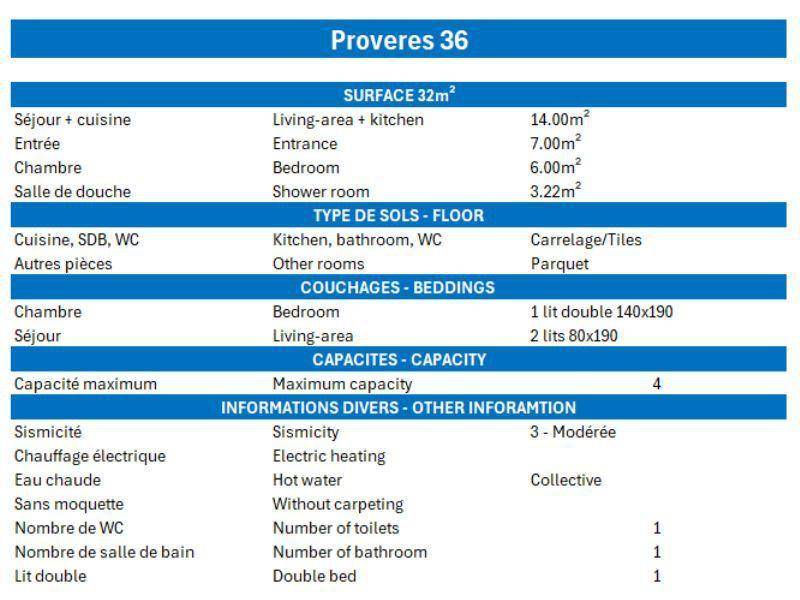 Die Residenz Provères liegt 500 m von den Geschäften entfernt. Sie erreichen sie über eine Treppe zwischen den Residenzen des Einkaufszentrums Mottaret. Das Resortzentrum mit allen Aktivitäten liegt 300 m von der Residenz entfernt. Fläche von ungefähr 32 m². 3te Etage. Orientierung : Süd. Wohnzimmer mit 2 Ausziehbetten. Schlafzimmer mit Doppelbett (140*190). Kochnische mit Wasserkocher, Kaffeemaschine, kleiner Backofen mit Mikrowellenfunktion, Toaster, Geschirrspülmaschine, 2 Glaskeramikkochfelder, Kühlschrank. Badezimmer mit Dusche, WC. Balkon.