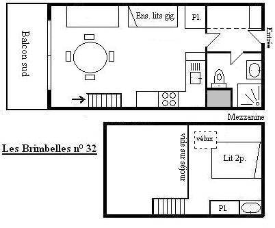 Die Residenz LEs Brimbelles (mit Aufzug) befinet sich ca. 100 Meter entfernt von den Pisten, vom Zentrum der Station Méribel in den französischen Nordalpen. Eine Haltestelle steht vor der Residenz (kostenlose Dienstleistung). Jedes Studio oder jede Wohnung hat einen Balkon und ein Skifach. Residenz mit Kabelanschluss: Möglichkeit, einen Fernseher zu mieten. Fläche von ungefähr 31 m². 6te Etage. Orientierung : Süd. Wohnzimmer mit 2 Ausziehbetten (80*190), Einzelbett (80*190). Mansardenzwischengeschoss (-1,80 m) mit Doppelbett (160*200). Kochnische mit Backofen, kleiner Backofen mit Mikrowellenfunktion, Geschirrspülmaschine, elektronische Herdplatten, Kühlschrank. Waschräume mit Dusche, WC. Balkon.