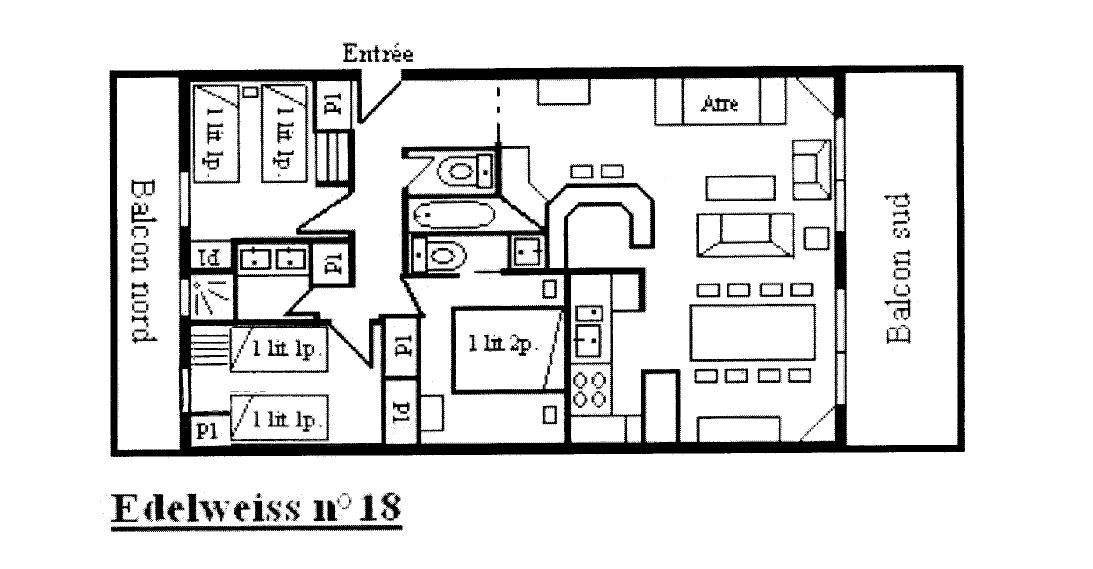 Die Residenz L'Edelweiss (mit Aufzug) befindet sich in der Staftmitte. Sie steht auf den Pisten und ca. 200 Meter von der Pendelbushaltestelle (kostenlosen Dienst). Fläche von ungefähr 26 m². 4te Etage. Orientierung : Süd. Diele mit 2 Stockbetten (80*180). Wohnzimmer mit 2 Ausziehbetten (80*190), TV. Kochnische mit kleiner Backofen mit Mikrowellenfunktion, Geschirrspülmaschine, Glaskeramikkochfelder, Kühlschrank. Badezimmer mit WC. Balkon. Die oberen Betten sind nicht für Kinder unter 6 Jahren geeignet.