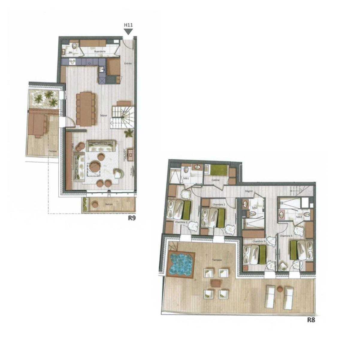 Fläche von ungefähr 154 m². Einige als Maisonette. 1te Etage. Niveau 0 : Wohnzimmer mit Ethanol-Kamin. Küche mit Wasserkocher, Kaffeemaschine (Nespresso), Backofen, Toaster, Dunstabzugshaube, Geschirrspülmaschine, Herdplatten, , Kühlschrank. Waschküche mit Waschmaschine, Wäschetrockner, WC. Terrasse. Balkon. Niveau -1 : 3 Schlafzimmer mit Doppelbett, , Haartrockner, Handtuchtrockner, WC. Schlafzimmer mit Doppelbett. offener Schlafbereich mit 2 Stockbetten. Terrasse mit Whirlpool. Die oberen Betten sind nicht für Kinder unter 6 Jahren geeignet.