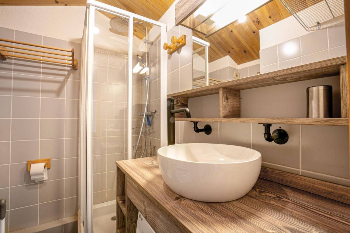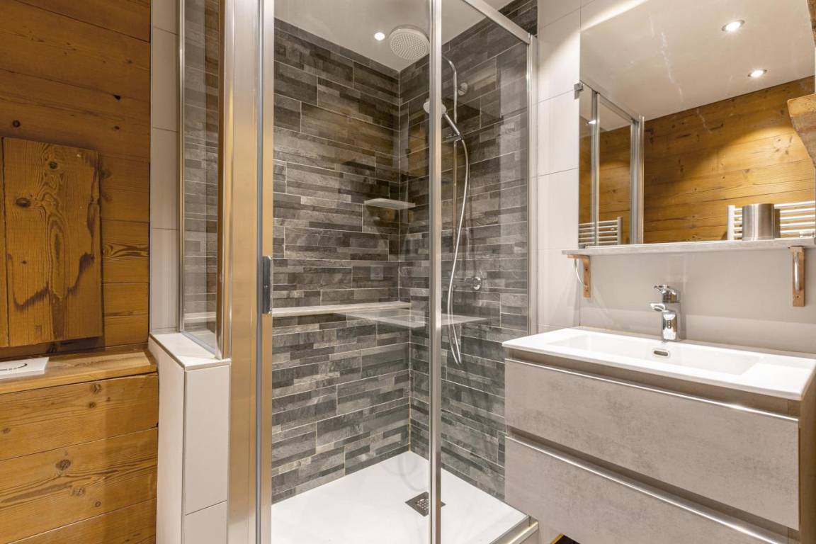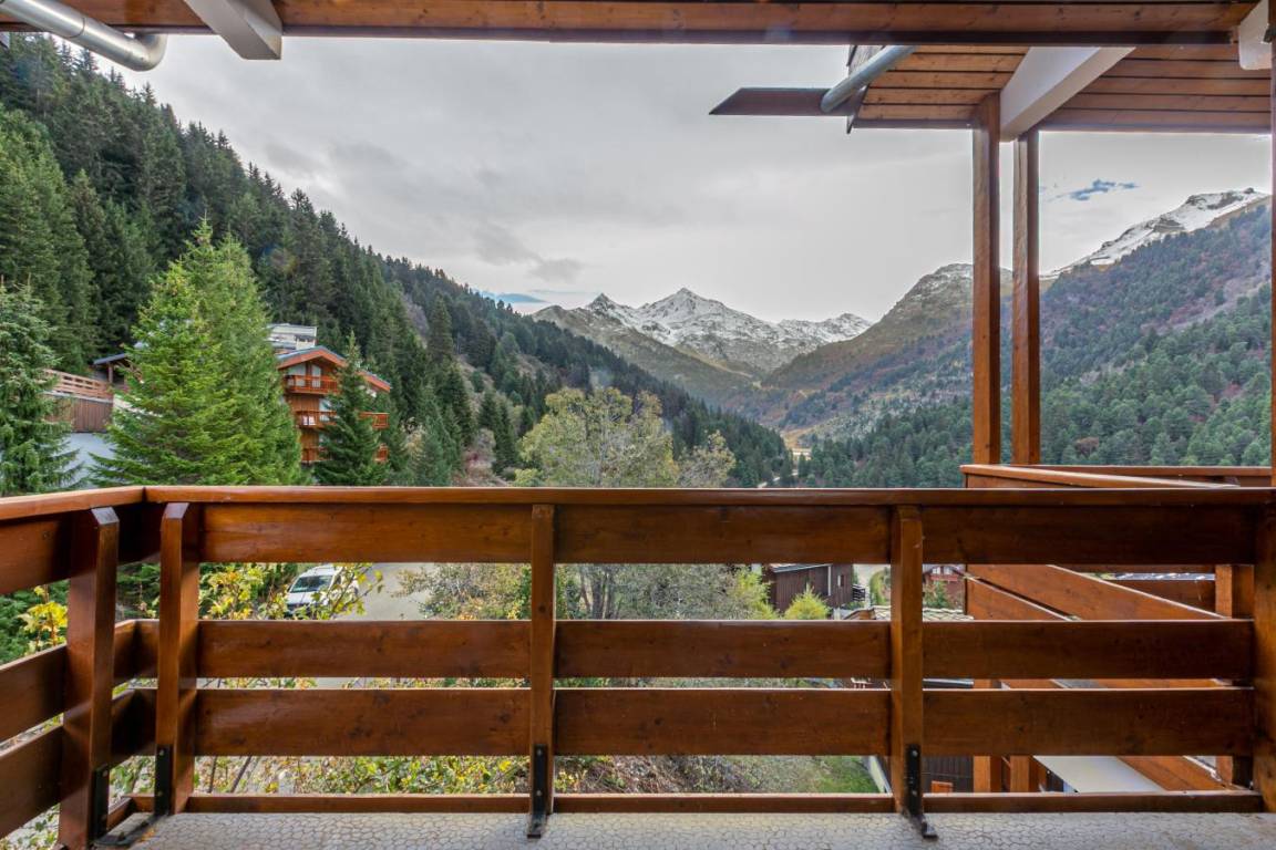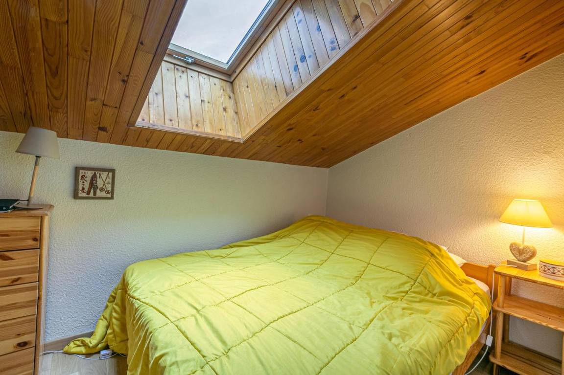 Fläche von ungefähr 45 m². 3te Etage. Orientierung : Süd. Blick berg. Diele. Wohnzimmer mit einfache Klappschlafcouch, Ausziehschlafcouch für 2 Personen, Heizkörper. Schlafzimmer mit Doppelbett (140x190), Heizkörper. Zwischengeschoss mit Einzelbett (80x190). offener Schlafbereich mit 2 Stockbetten, Heizkörper. Küche mit Fonduegerät, Raclettegerät, Kaffeemaschine, Backofen, kleiner Backofen mit Mikrowellenfunktion, Toaster, Mixer, Induktionsherdplatten. 2 Waschräume mit Dusche. Balkon mit Stuhl. Die oberen Betten sind nicht für Kinder unter 6 Jahren geeignet.