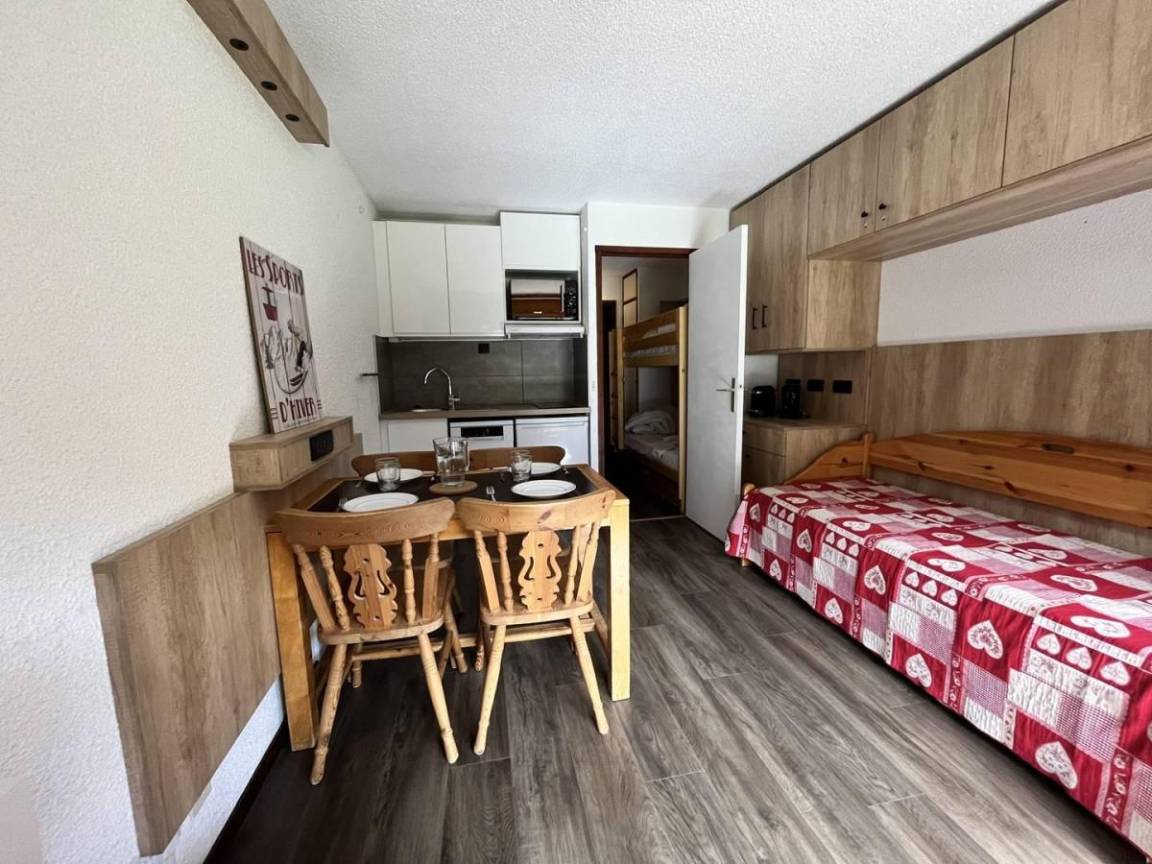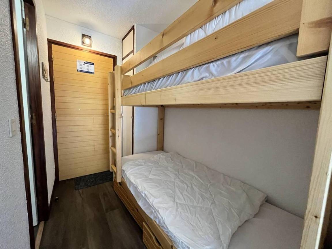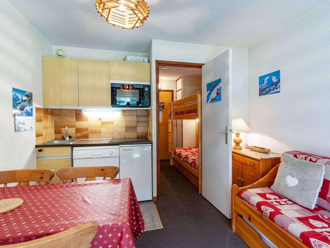 Fläche von ungefähr 20 m². 4te Etage. Orientierung : West. Wohnzimmer mit 2 Ausziehbetten (90*190). offener Schlafbereich mit 2 Stockbetten (80*190). Kochnische mit Kaffeemaschine (Nespresso), kleiner Backofen mit Mikrowellenfunktion, Geschirrspülmaschine, 2 Induktionsherdplatten, Kühlschrank. Badezimmer mit WC. Balkon. Waschmaschine. Die oberen Betten sind nicht für Kinder unter 6 Jahren geeignet.