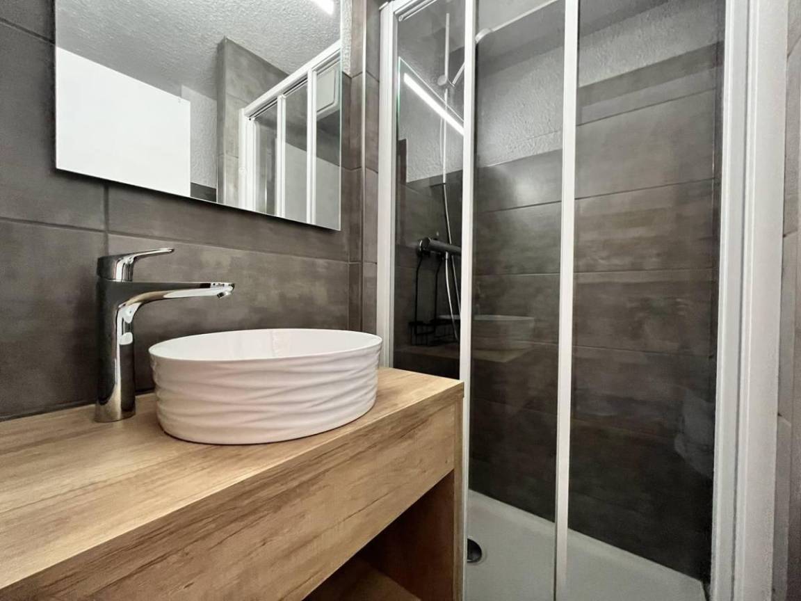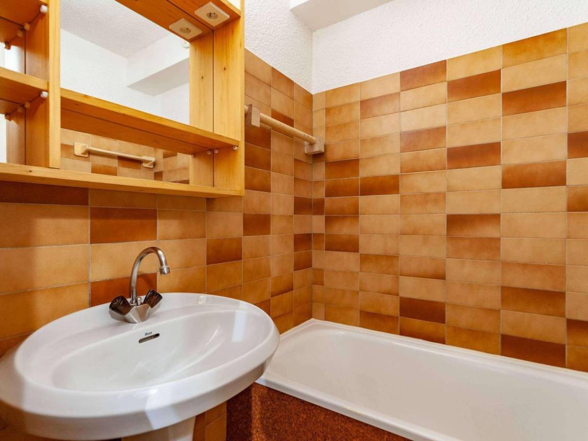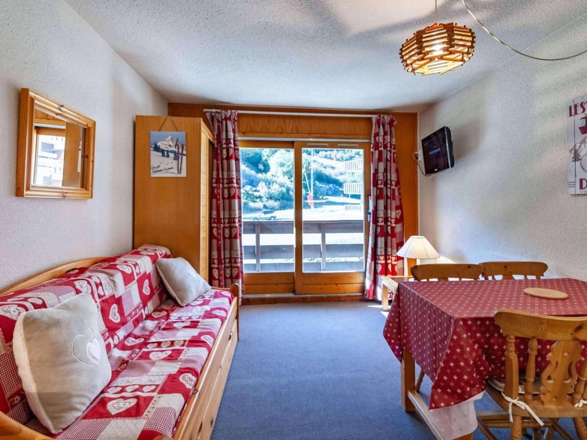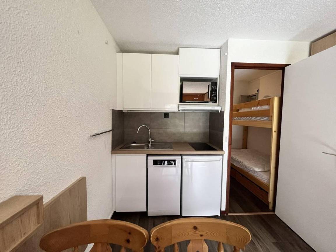 Fläche von ungefähr 20 m². 4te Etage. Orientierung : West. Wohnzimmer mit 2 Ausziehbetten (90*190). offener Schlafbereich mit 2 Stockbetten (80*190). Kochnische mit Kaffeemaschine (Nespresso), kleiner Backofen mit Mikrowellenfunktion, Geschirrspülmaschine, 2 Induktionsherdplatten, Kühlschrank. Badezimmer mit WC. Balkon. Waschmaschine. Die oberen Betten sind nicht für Kinder unter 6 Jahren geeignet.