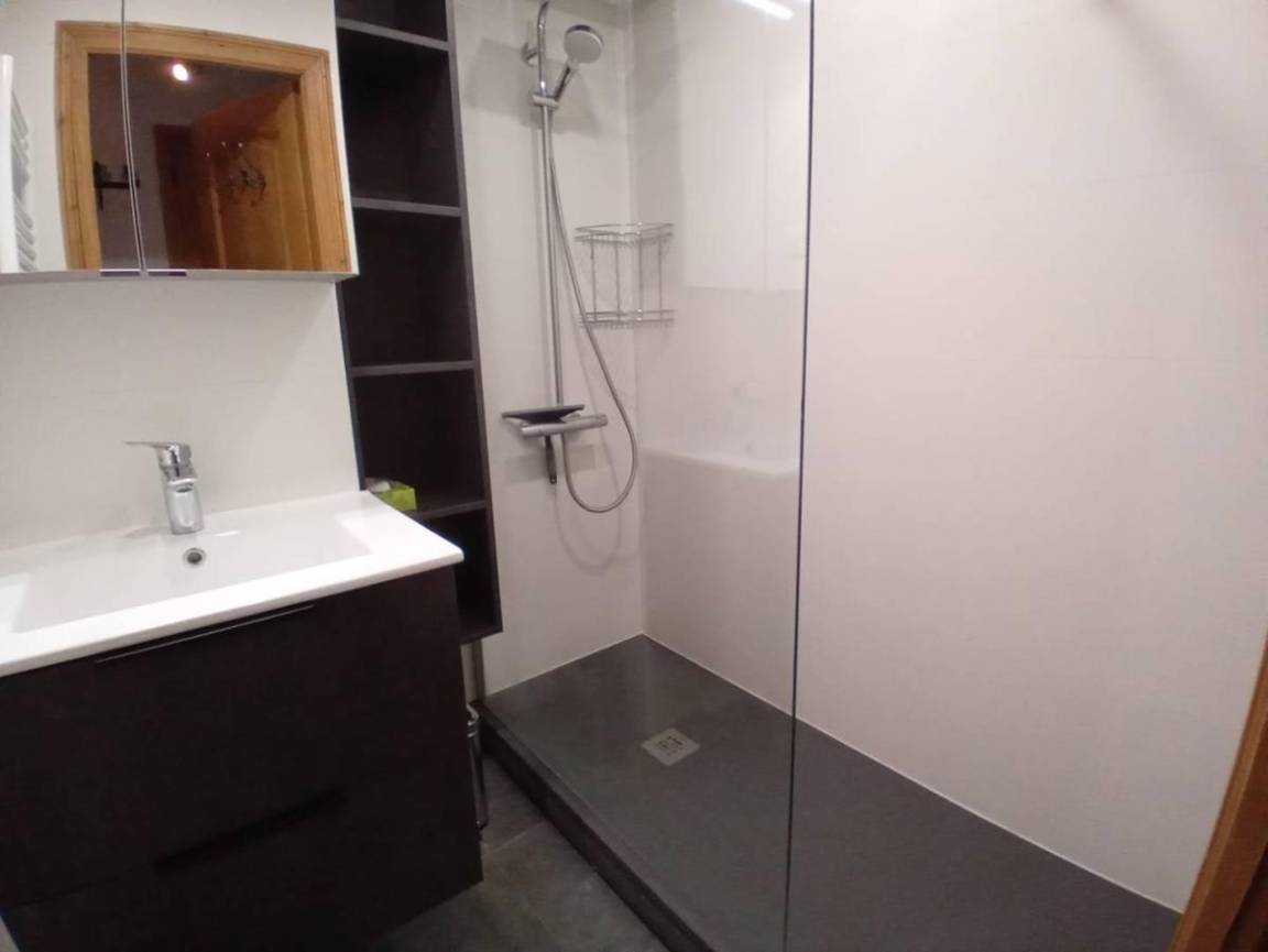 Fläche von ungefähr 44 m². Orientierung : Nord-West. Blick parkmöglichkeiten. Diele mit Heizkörper. Wohnzimmer mit einfache Klappschlafcouch, DVD-Spieler, Ausziehschlafcouch für 2 Personen, Heizkörper. Schlafzimmer mit Doppelbett (140x190), Heizkörper. Schlafzimmer mit einfaches Mezzanine Bett, Einzelbett (90x190), Heizkörper. Küche mit Raclettegerät, 2 Kaffeemaschinen, Backofen, kleiner Backofen mit Mikrowellenfunktion, Toaster, Mixer, Glaskeramikkochfelder, Kühlschrank. Badezimmer. WC. Balkon.