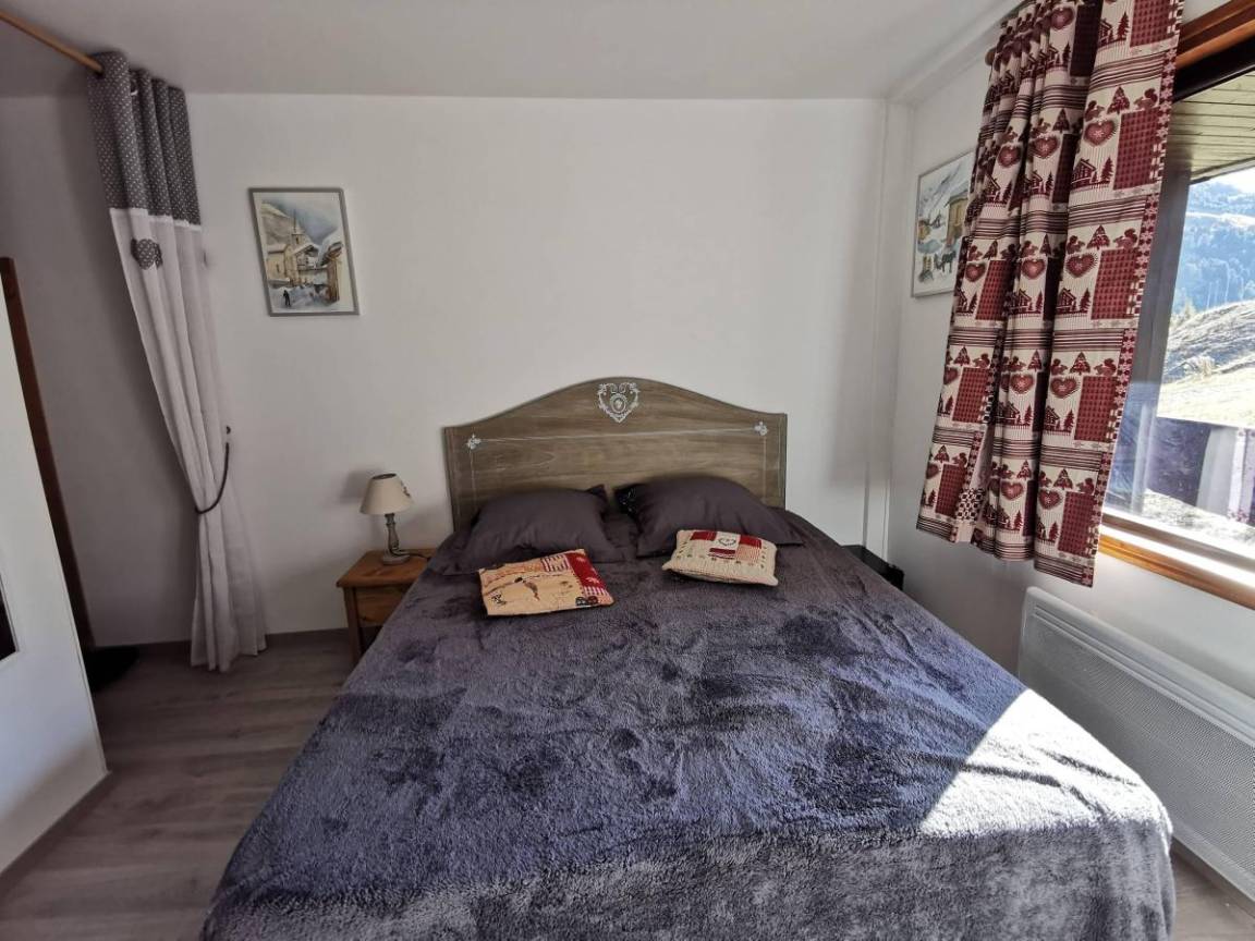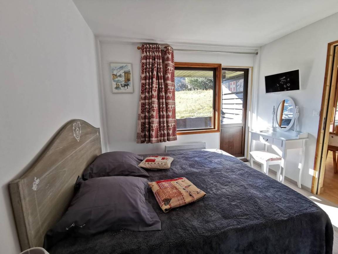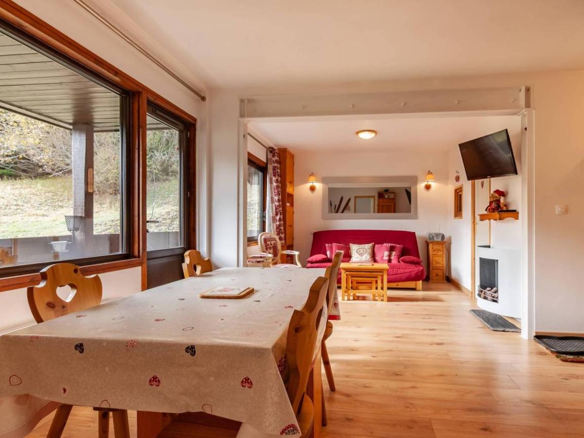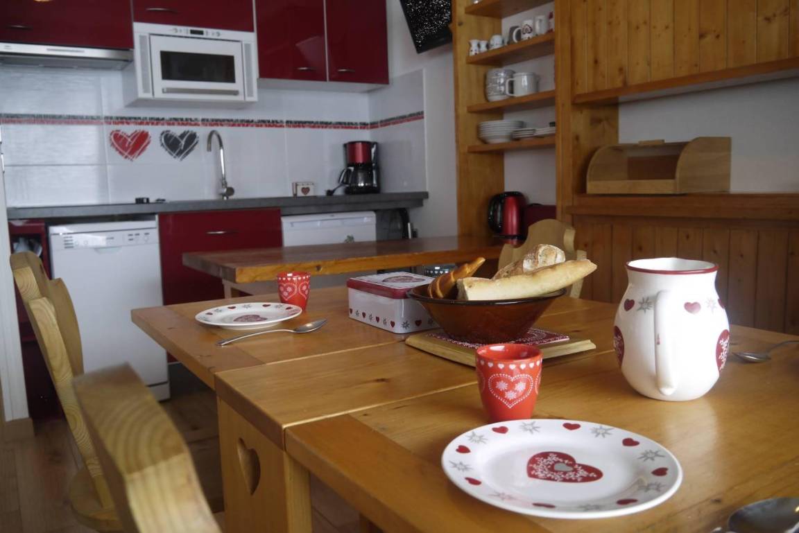 Fläche von ungefähr 48 m². 2te Etage. Orientierung : Süd. Diele. Wohnzimmer mit Kamin, Klappschlafcouch, Heizkörper. Schlafzimmer mit Badewanne, 2 Einzelbetten (90x190), Heizkörper, WC. offener Schlafbereich mit 2 Stockbetten, Heizkörper. Küche mit Fonduegerät, Raclettegerät, Kaffeemaschine, kleiner Backofen mit Mikrowellenfunktion, Toaster, Mixer, Glaskeramikkochfelder, Kühlschrank, Tisch. 2 Badezimmer. WC. Balkon mit Tisch. Die oberen Betten sind nicht für Kinder unter 6 Jahren geeignet.