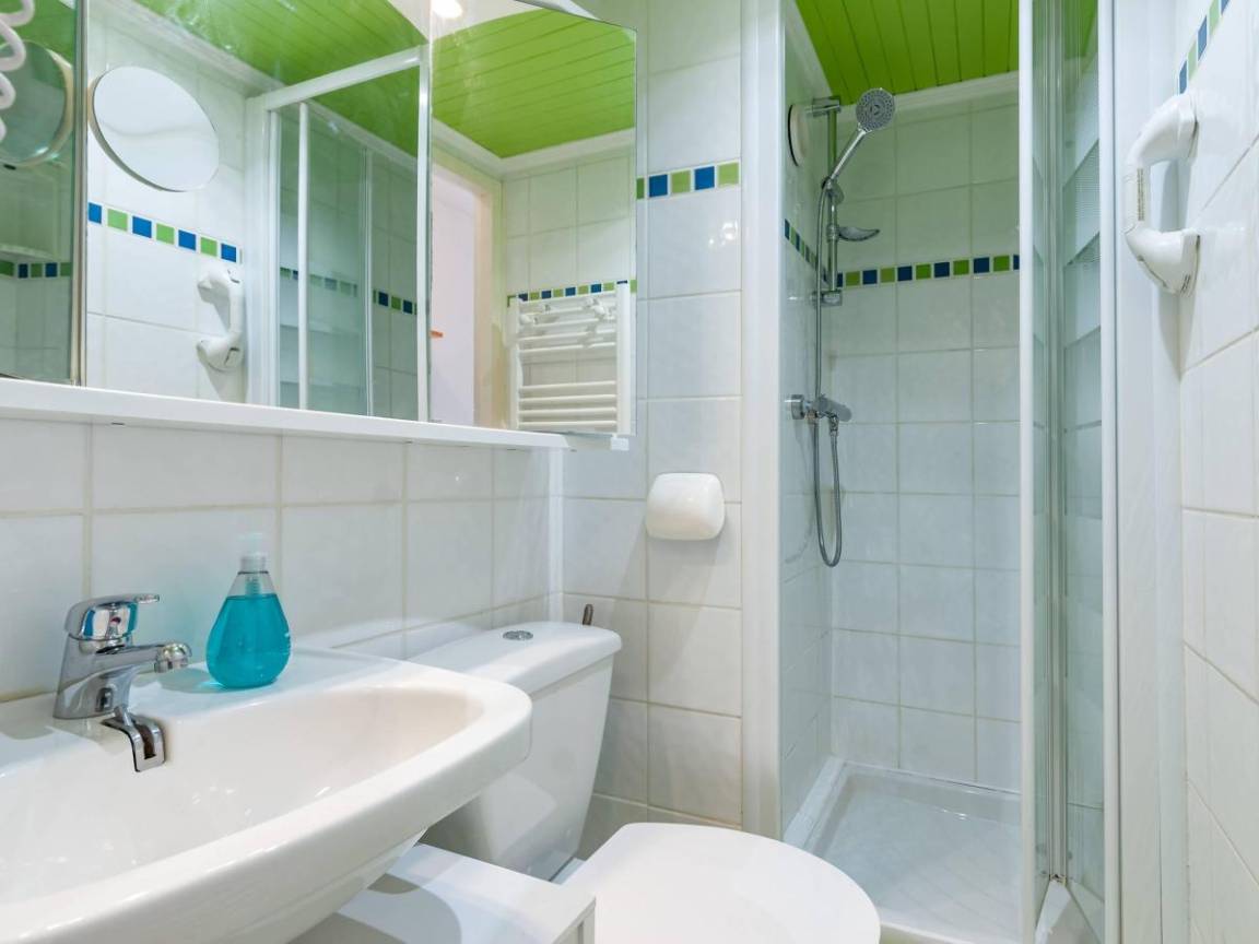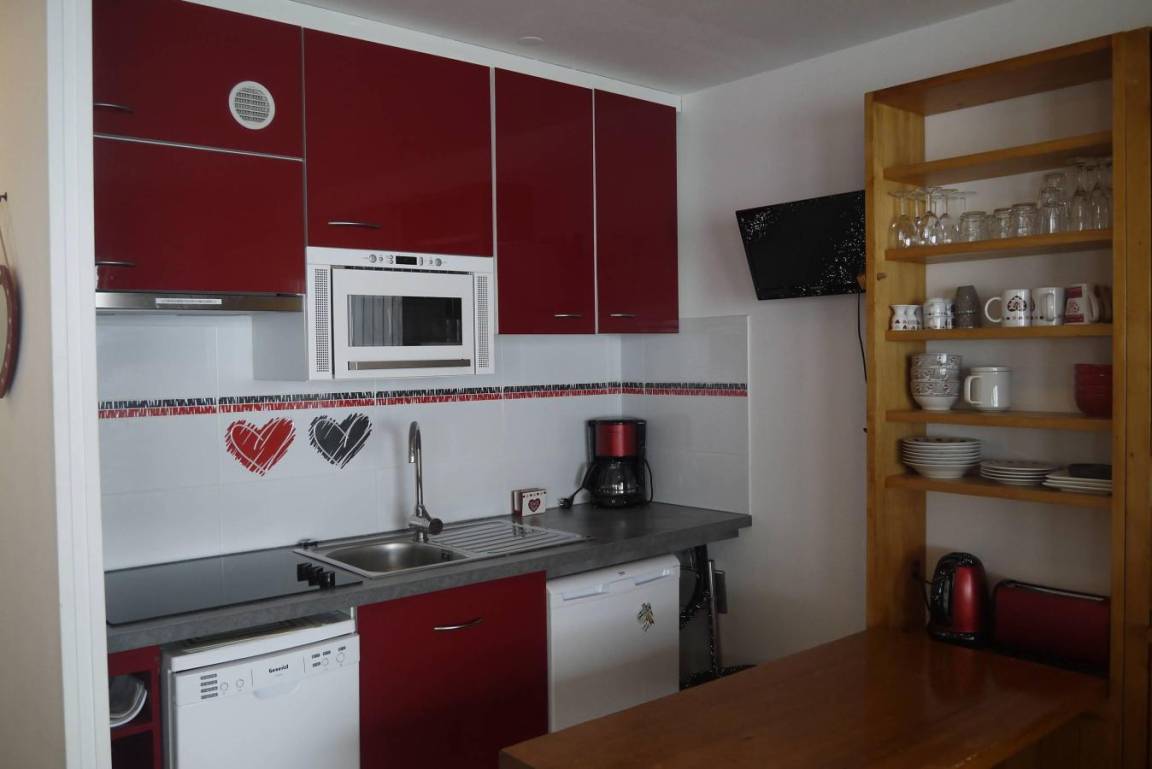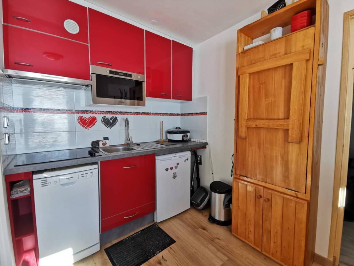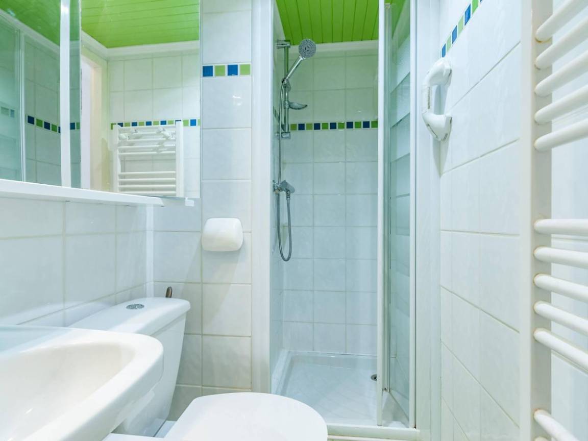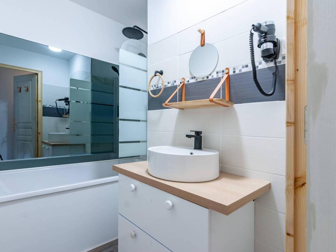 Fläche von ungefähr 48 m². 2te Etage. Orientierung : Süd. Diele. Wohnzimmer mit Kamin, Klappschlafcouch, Heizkörper. Schlafzimmer mit Badewanne, 2 Einzelbetten (90x190), Heizkörper, WC. offener Schlafbereich mit 2 Stockbetten, Heizkörper. Küche mit Fonduegerät, Raclettegerät, Kaffeemaschine, kleiner Backofen mit Mikrowellenfunktion, Toaster, Mixer, Glaskeramikkochfelder, Kühlschrank, Tisch. 2 Badezimmer. WC. Balkon mit Tisch. Die oberen Betten sind nicht für Kinder unter 6 Jahren geeignet.