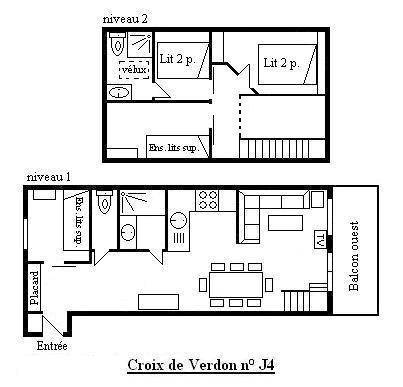 Die Residenz La Croix de Verdon befindet sich in der Nähe der Skibushaltestelle (kostenloser Service) im Stadtzentrum, etwa 150 m von den Skipisten entfernt. Fläche von ungefähr 75 m². 4te Etage. Orientierung : West. Niveau 0 : Wohnzimmer mit TV. Schlafzimmer mit 2 Stockbetten (80*190). Kochnische mit Backofen, kleiner Backofen mit Mikrowellenfunktion, Geschirrspülmaschine, elektronische Herdplatten, Kühlschrank. separates WC. Waschräume. Balkon. Niveau 1 : 2 Schlafzimmer mit Doppelbett (140). offener Schlafbereich mit 2 Stockbetten (80*190). Waschräume mit WC. Die oberen Betten sind nicht für Kinder unter 6 Jahren geeignet.