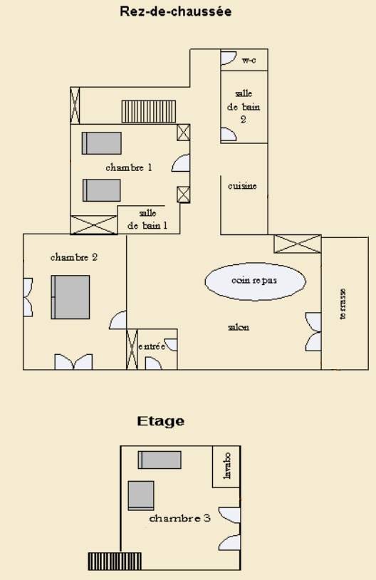 Chalet bestehend aus 2 Gîtes + Zweitwohnsitz der Eigentümer. Unabhängiger Zugriff. Erdgeschoss + 1. Stock: Wohnküche mit Sitzecke, 2 Schlafzimmer, 1 mit eigenem Duschbad (1 Doppelbett 140x190 cm / 2 Einzelbetten 80x190 cm), 1 Schlafzimmer im Zwischengeschoss (2 1 Person in 80x190 cm Twin) , Badezimmer (Dusche). Terrasse. Gemeinsamkeit. Skigondelverbindung Méribel und Pisten auf 200m. Thermen von Brides les Bains 10 km.