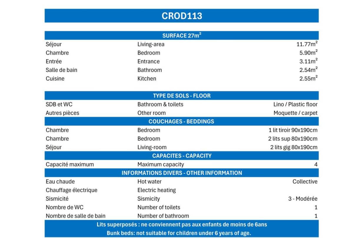 Die Residenz Creux de l'Ours vert ist ideal am Fuße der Wanderwege und in der Nähe der Geschäfte gelegen. Das Resortzentrum liegt 1000 m von der Residenz entfernt. Fläche von ungefähr 27 m². 4te Etage. Orientierung : Süd, West. Wohnzimmer mit 2 Ausziehbetten (80*190). Schlafzimmer mit 2 Stockbetten (80*190), Ausziehbett (90*190). Kochnische mit Wasserkocher, Backofen, Toaster, Dunstabzugshaube, Geschirrspülmaschine, Mikrowellenherd, 2 Glaskeramikkochfelder, Kühlschrank. Badezimmer mit Badewanne. separates WC. Die oberen Betten sind nicht für Kinder unter 6 Jahren geeignet.