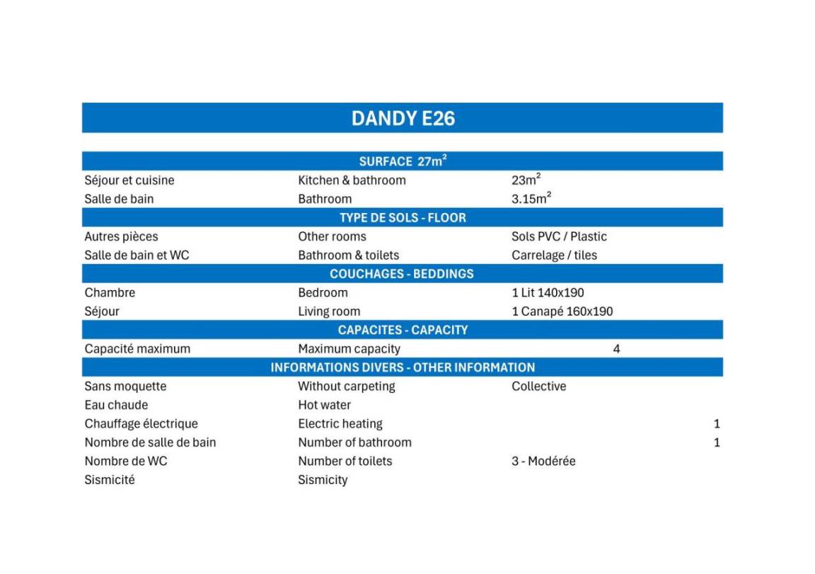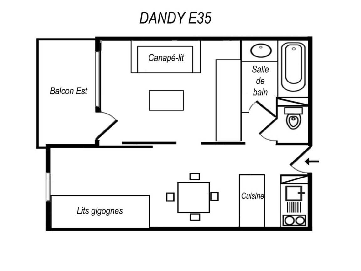 Die Residenz Dandy liegt ideal neben den Geschäften. Alle Dienstleistungen und Aktivitäten befinden sich in der Nähe der Residenz. Fläche von ungefähr 27 m². 3te Etage. Orientierung : Ost. Wohnzimmer mit 2 Ausziehbetten (90*190), Vorhang zum schließen. Schlafbereich mit Klappschlafcouch (140*190), schiebetüren. Kochnische mit Wasserkocher, Kaffeemaschine (électrique), kleiner Backofen mit Mikrowellenfunktion, Toaster, Dunstabzugshaube, Geschirrspülmaschine, 2 Glaskeramikkochfelder, Kühlschrank. Badezimmer mit Badewanne. separates WC. Balkon.