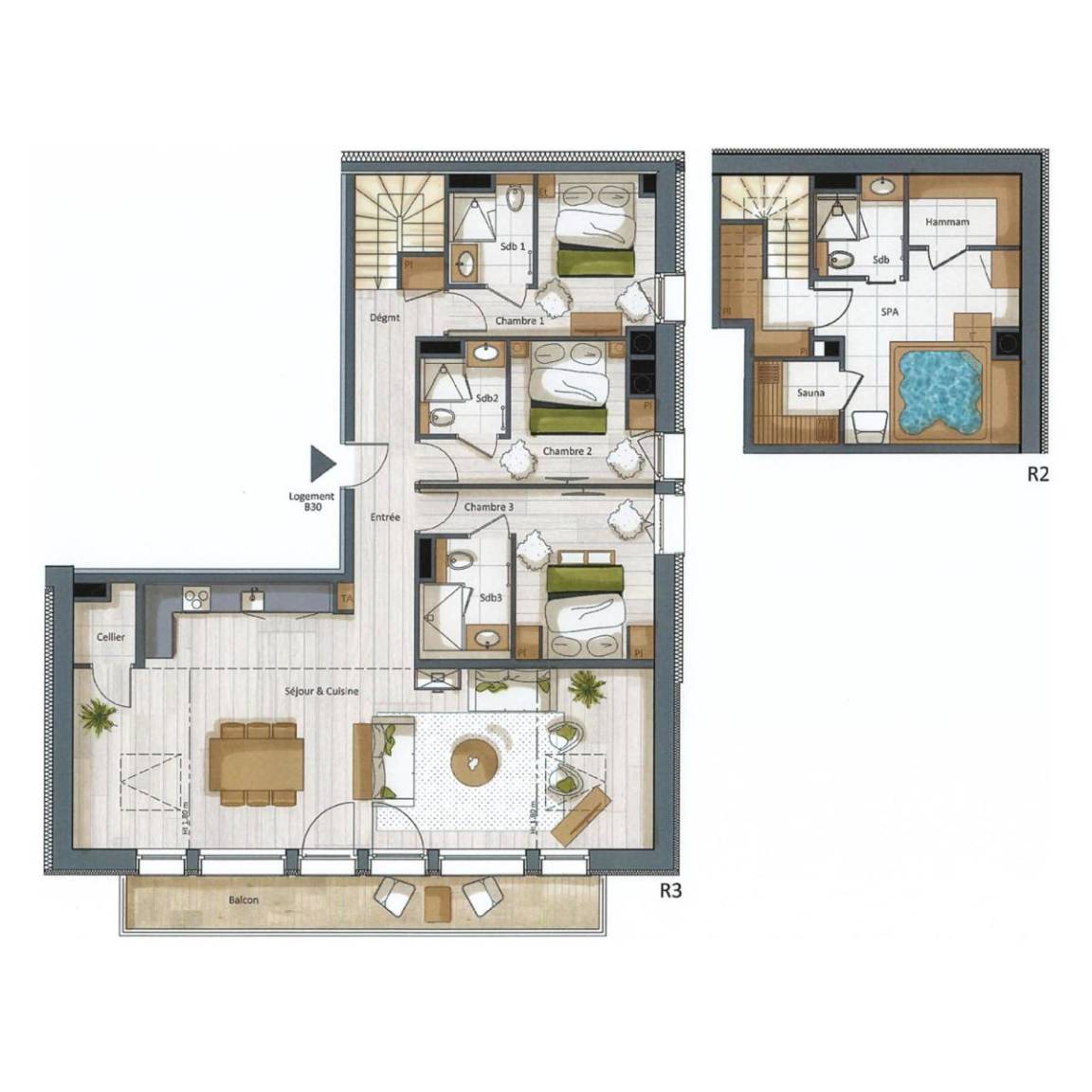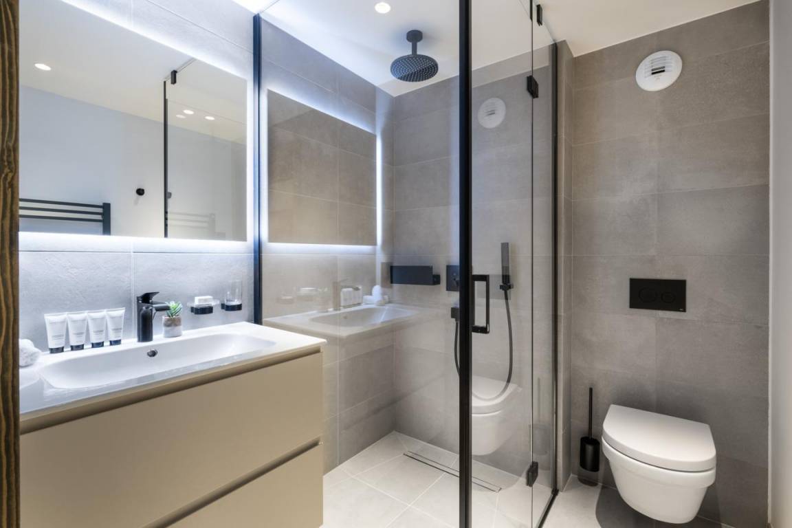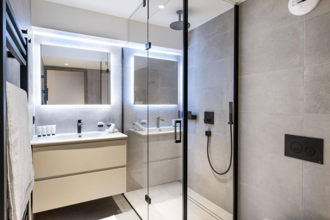 Fläche von ungefähr 147 m². 4te Etage. Orientierung : Süd, West. Blick berg. Niveau 0 : Wohnzimmer. 3 Schlafzimmer mit Doppelbett, , Haartrockner, Handtuchtrockner, WC. Küche mit Wasserkocher, Kaffeemaschine (Nespresso), Backofen, Toaster, Dunstabzugshaube, Waschmaschine, Geschirrspülmaschine, Herdplatten, , Kühlschrank. Balkon. Keller. Niveau -1 : Badezimmer mit WC. Entspannungsbereich mit Dampfbad, Whirlpool, Sauna.