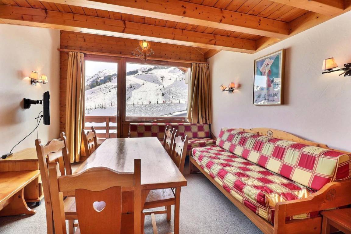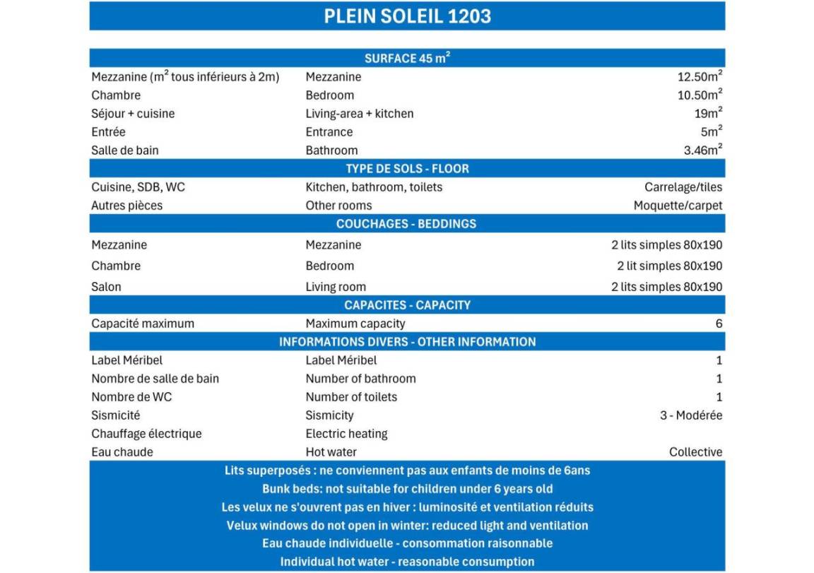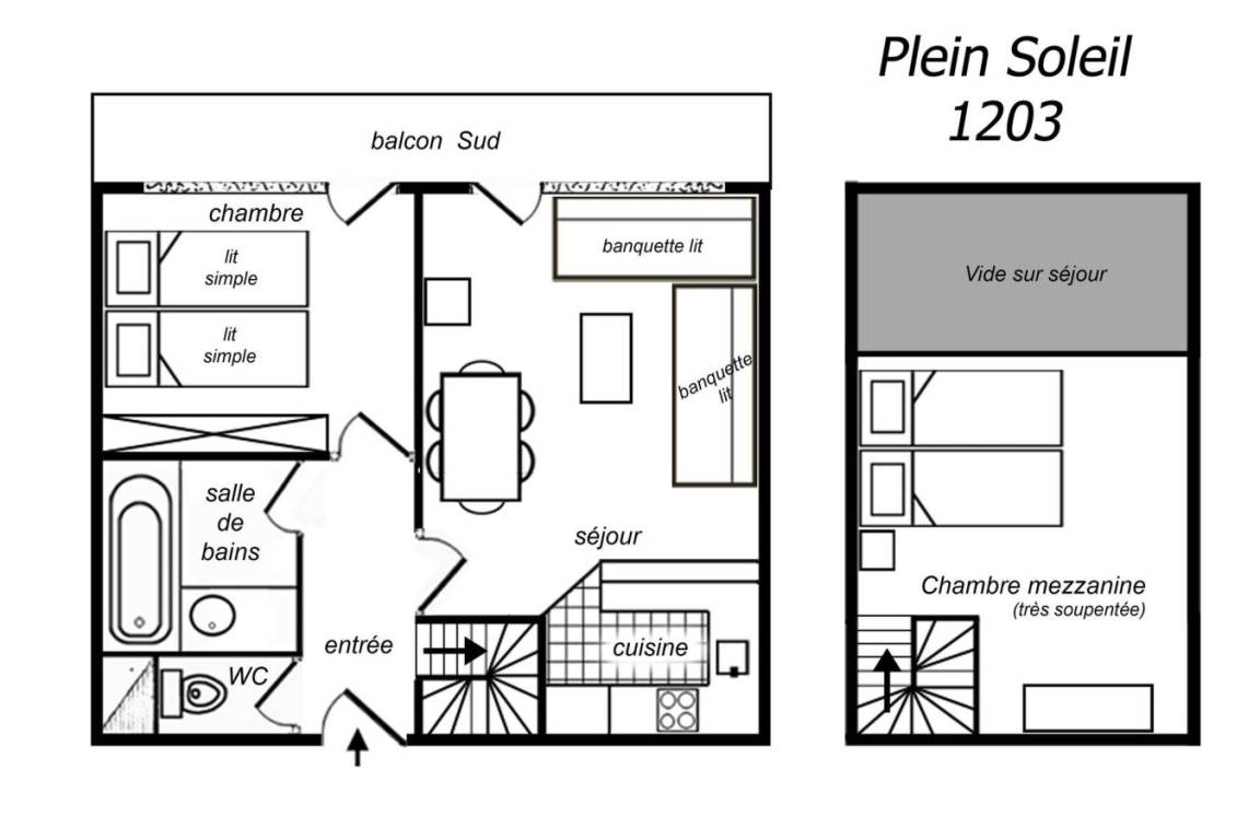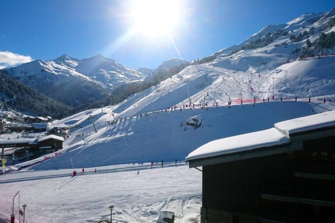 Die Residenz Plein Soleil mit Aufzug liegt ideal in der Nähe von Geschäften, 100 m von der Residenz entfernt. Sie erreichen sie über die Treppe zwischen den Residenzen des Einkaufszentrums von Mottaret. Die nächste Bushaltestelle ist nur 100 m entfernt. Die Residenz bietet zusätzliche Dienstleistungen wie Halbpension im Restaurant Le Grain de Sel und WLAN-Internetzugang. Es gibt auch ein Spielzimmer und eine Rezeption... Fläche von ungefähr 45 m². 5te Etage. Orientierung : Süd. Wohnzimmer mit 2 Sofabetten. Schlafzimmer mit 2 Einzelbetten. Zwischengeschoss mit 2 Einzelbetten. Kochnische mit Wasserkocher, Kaffeemaschine, kleiner Backofen mit Mikrowellenfunktion, Toaster, Dunstabzugshaube, Geschirrspülmaschine, 4 Glaskeramikkochfelder, Kühlschrank. Badezimmer mit Badewanne. WC. Balkon.