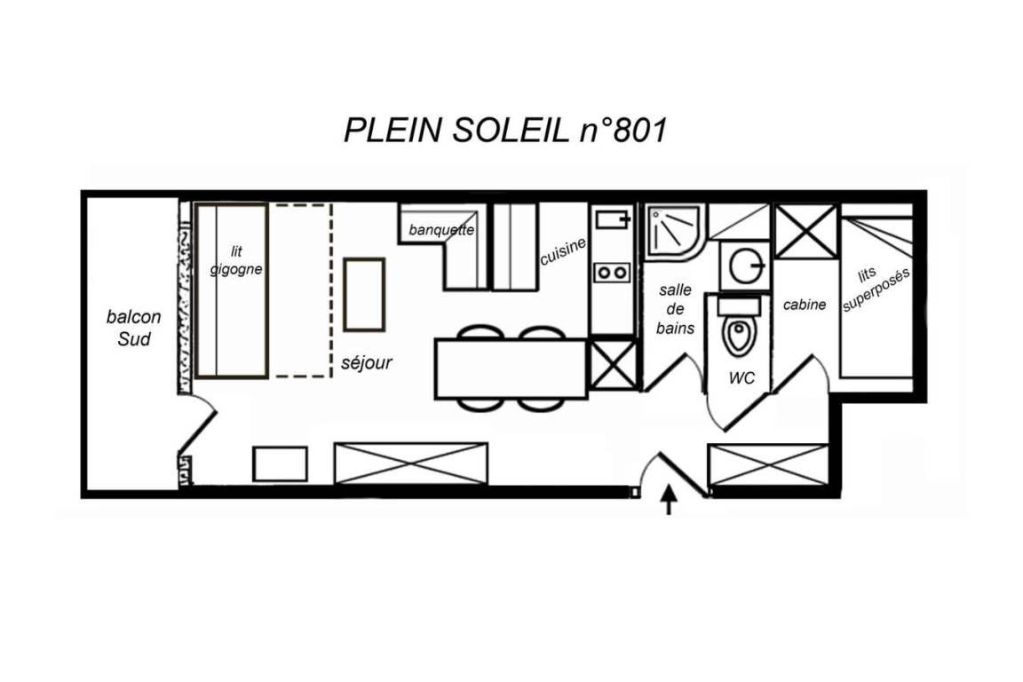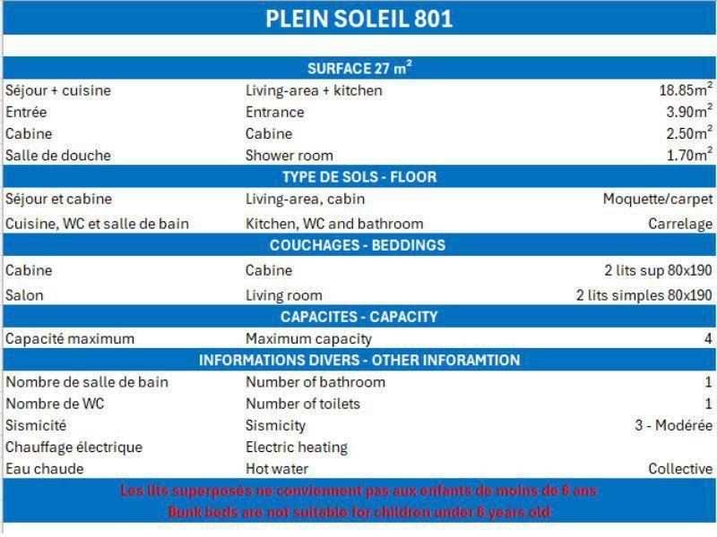 Die Residenz Plein Soleil mit Aufzug liegt ideal in der Nähe von Geschäften, 100 m von der Residenz entfernt. Sie erreichen sie über die Treppe zwischen den Residenzen des Einkaufszentrums von Mottaret. Die nächste Bushaltestelle ist nur 100 m entfernt. Die Residenz bietet zusätzliche Dienstleistungen wie Halbpension im Restaurant Le Grain de Sel und WLAN-Internetzugang. Es gibt auch ein Spielzimmer und eine Rezeption... Fläche von ungefähr 27 m². 1te Etage. Orientierung : Süd. Wohnzimmer mit Ausziehschlafcouch für 2 Personen. offener Schlafbereich mit 2 Stockbetten. Küche mit Wasserkocher, Kaffeemaschine (nespresso), Backofen, Toaster, Waschmaschine, Geschirrspülmaschine, Mikrowellenherd, 2 elektronische Herdplatten, Kühlschrank. Badezimmer mit Dusche. separates WC. Balkon. Die oberen Betten sind nicht für Kinder unter 6 Jahren geeignet.