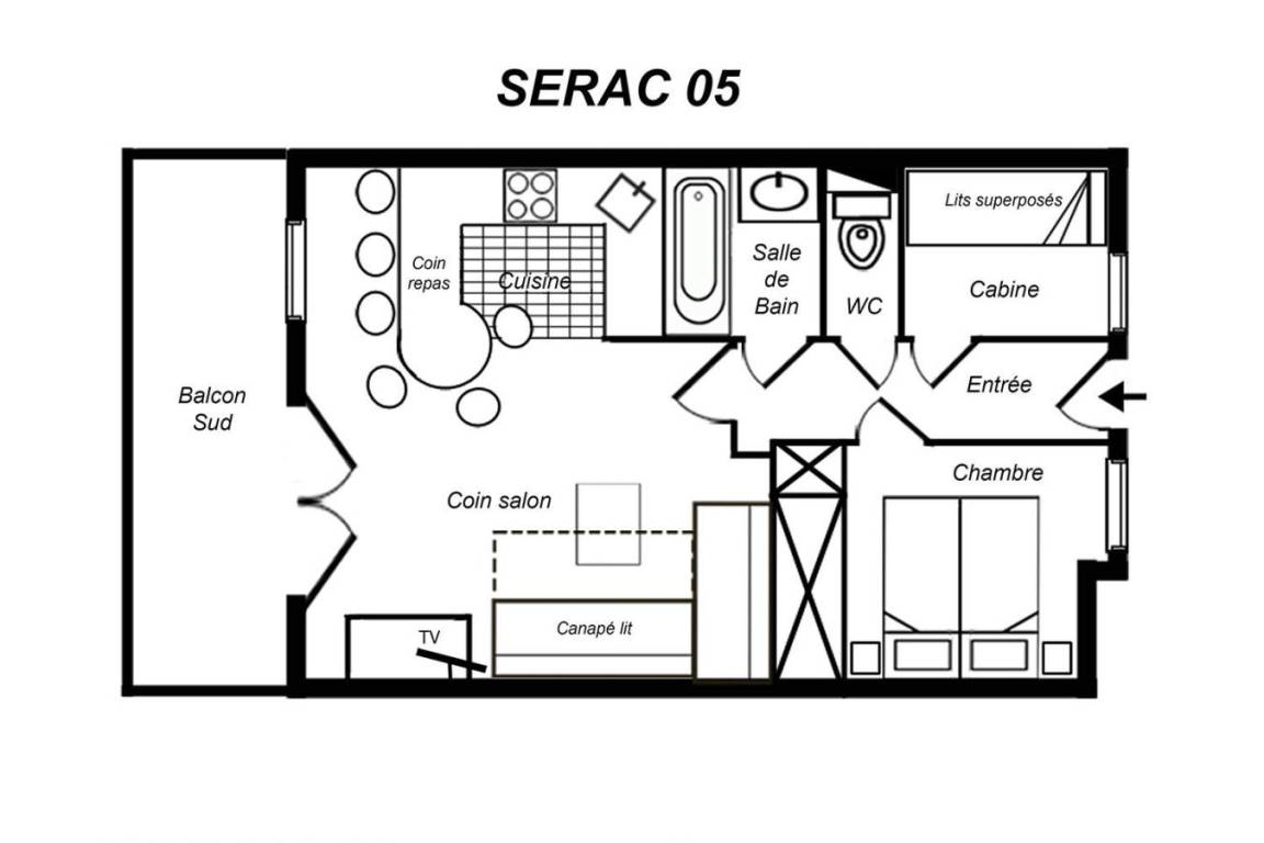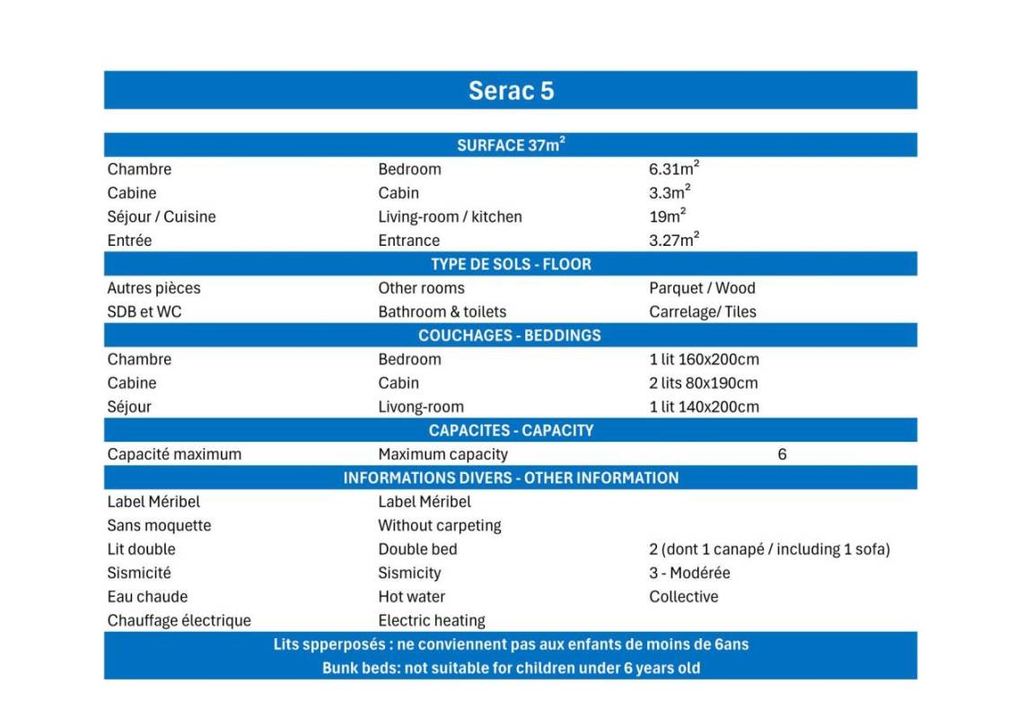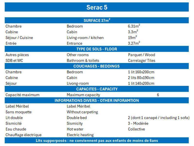 Die Residenz Sérac liegt 400 m vom Geschäftszentrum von Chatelet entfernt, in einer ruhigen Gegend mit herrlicher Lage. Das Zentrum des Resorts liegt 900 m vom Gebäude entfernt. Fläche von ungefähr 37 m². Etage -2. Orientierung : Süd. Blick berg (Mont Vallon). Wohnzimmer mit Sofa, Klappschlafcouch (140*200). Schlafzimmer mit Doppelbett (160*200) oder 2 Einzelbetten (80*200). offener Schlafbereich mit 2 Stockbetten (80*200). Kochnische mit Wasserkocher, 2 Kaffeemaschinen (Philips et italienne), kleiner Backofen mit Mikrowellenfunktion, Toaster, Geschirrspülmaschine, 4 Induktionsherdplatten, Kühlschrank. Badezimmer mit WC. Balkon. Die oberen Betten sind nicht für Kinder unter 6 Jahren geeignet.