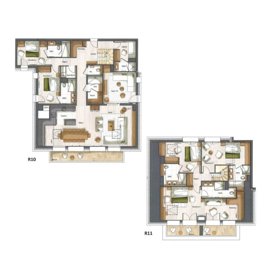 Fläche von ungefähr 249 m². Einige als Maisonette. 2te Etage. Orientierung : Nord, West. Blick berg. Niveau 0 : Wohnzimmer mit Kamin. 2 Schlafzimmer mit Doppelbett, , WC. offener Schlafbereich mit . Dressing. Küche mit Wasserkocher, Kaffeemaschine (Nespresso), Backofen, Toaster, Dunstabzugshaube, Geschirrspülmaschine, Herdplatten, , Kühlschrank. separates WC. Waschküche mit Waschmaschine, Wäschetrockner. Balkon. Entspannungsbereich mit Dusche, Sauna. . Niveau 1 : 2 Schlafzimmer mit Ankleideraum, Doppelbett, , WC. Schlafzimmer mit Doppelbett, (baignoire et douche), WC.