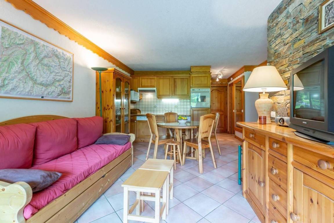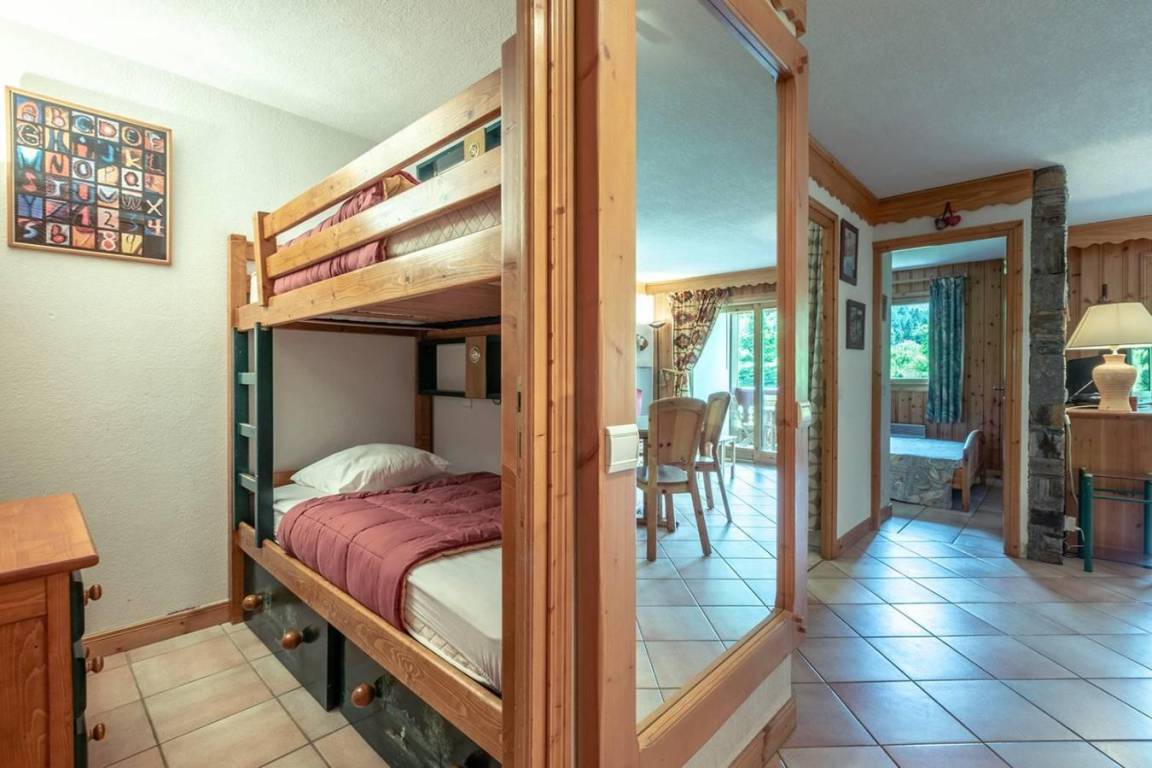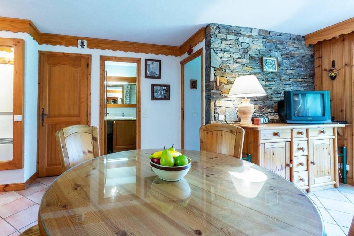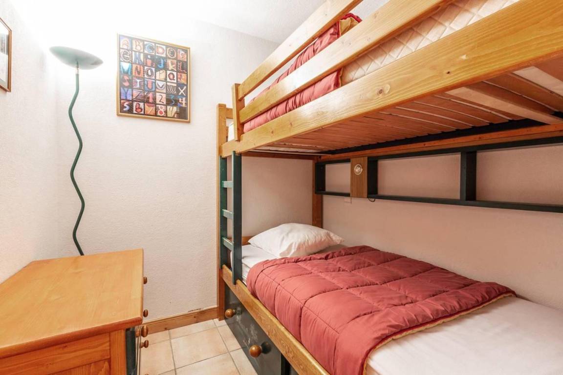 Fläche von ungefähr 40 m². Orientierung : Süd. Diele mit Heizkörper. Wohnzimmer mit einfache Klappschlafcouch, Ausziehschlafcouch für 2 Personen, Heizkörper, Radio. Schlafzimmer mit Doppelbett (140x190), Heizkörper. offener Schlafbereich mit 2 Stockbetten, Heizkörper. Küche mit Fonduegerät, Kaffeemaschine, Backofen, kleiner Backofen mit Mikrowellenfunktion, Toaster, Glaskeramikkochfelder, Kühlschrank. Badezimmer. WC. Balkon mit Tisch. Die oberen Betten sind nicht für Kinder unter 6 Jahren geeignet.