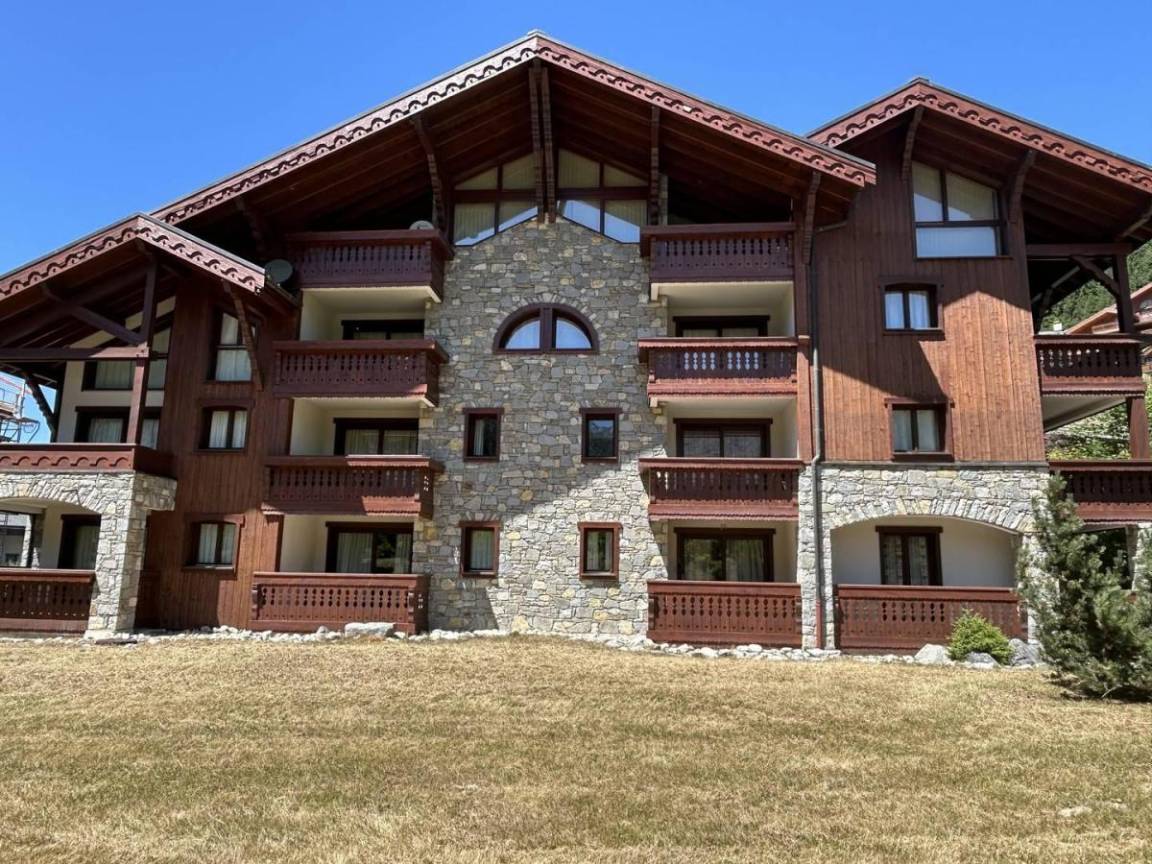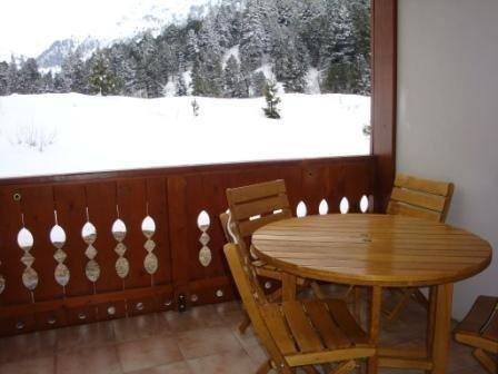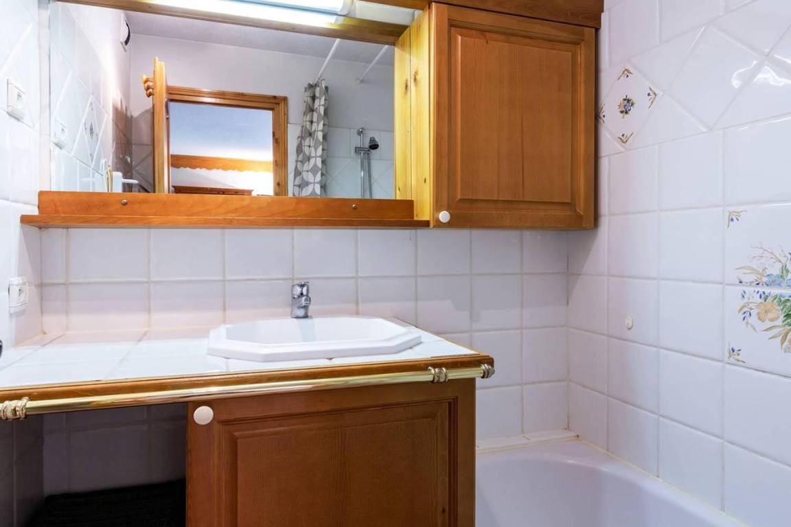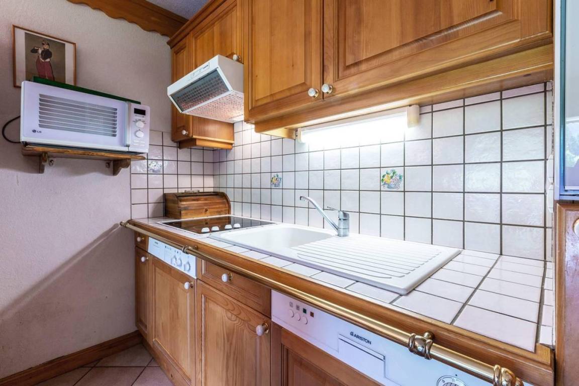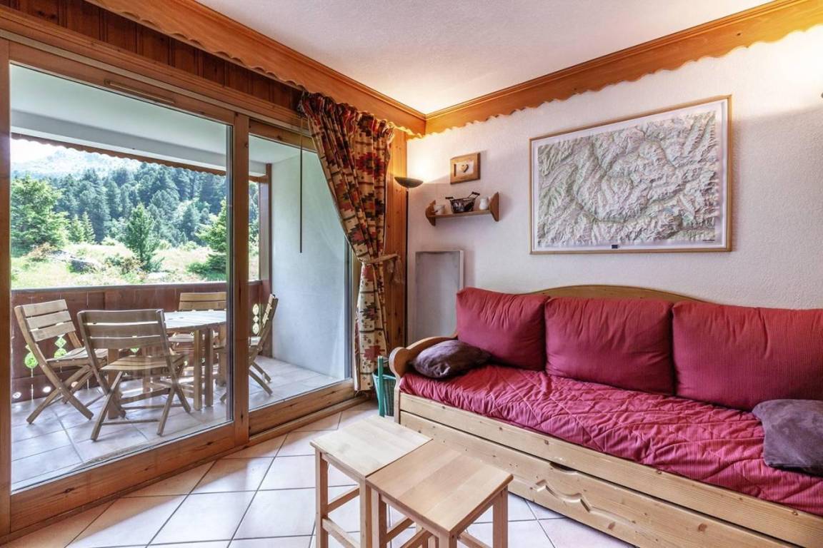 Fläche von ungefähr 40 m². Orientierung : Süd. Diele mit Heizkörper. Wohnzimmer mit einfache Klappschlafcouch, Ausziehschlafcouch für 2 Personen, Heizkörper, Radio. Schlafzimmer mit Doppelbett (140x190), Heizkörper. offener Schlafbereich mit 2 Stockbetten, Heizkörper. Küche mit Fonduegerät, Kaffeemaschine, Backofen, kleiner Backofen mit Mikrowellenfunktion, Toaster, Glaskeramikkochfelder, Kühlschrank. Badezimmer. WC. Balkon mit Tisch. Die oberen Betten sind nicht für Kinder unter 6 Jahren geeignet.
