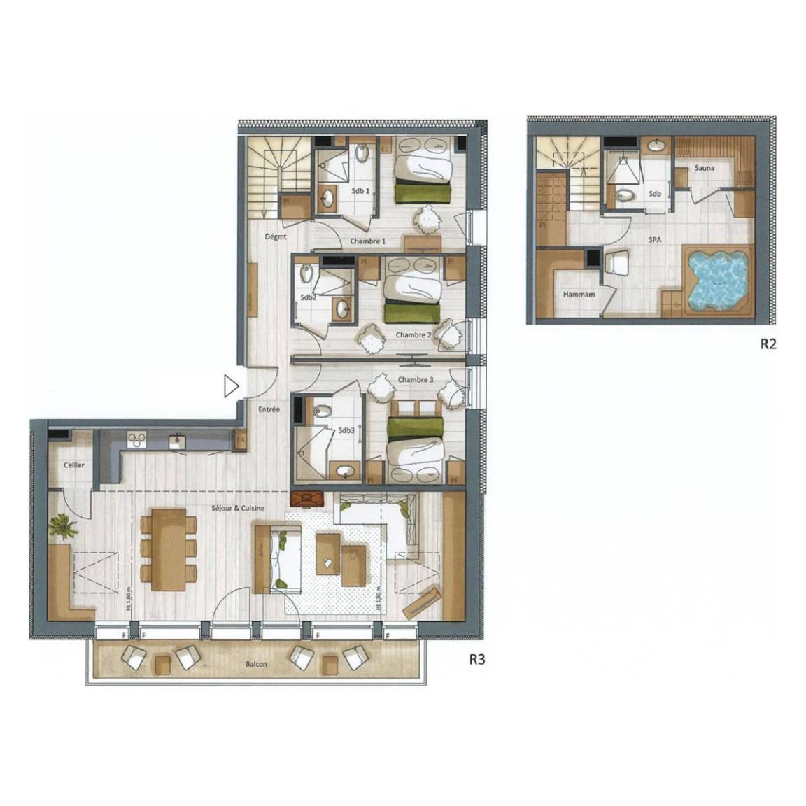 Fläche von ungefähr 148 m². Einige als Maisonette. 4te Etage. Orientierung : Süd, West. Blick berg. Niveau 0 : Wohnzimmer mit Kamin. 3 Schlafzimmer mit Doppelbett, , Haartrockner, Handtuchtrockner, WC. Küche mit Wasserkocher, Kaffeemaschine (Nespresso), Backofen, Toaster, Dunstabzugshaube, Waschmaschine, Geschirrspülmaschine, Herdplatten, , Kühlschrank. Balkon. Niveau -1 : Entspannungsbereich mit Dampfbad, Whirlpool, , Sauna, Haartrockner, Handtuchtrockner, WC.