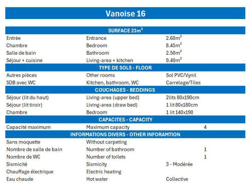 Die Residenz Vanoise liegt etwa 500 m von den Geschäften entfernt. Der Zugang zum Einkaufszentrum Mottaret erfolgt über eine Treppe zwischen den Residenzen. Fläche von ungefähr 23 m². 1te Etage. Orientierung : Nord. Blick tal. Wohnzimmer mit Ausziehschlafcouch für 2 Personen. Schlafzimmer mit Doppelbett. Kochnische mit Wasserkocher, Backofen, Toaster, Geschirrspülmaschine, 2 Glaskeramikkochfelder, Kühlschrank. Badezimmer mit WC. Balkon.