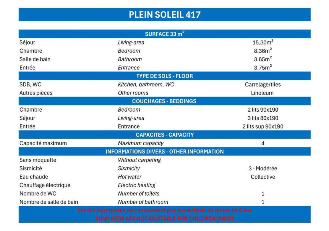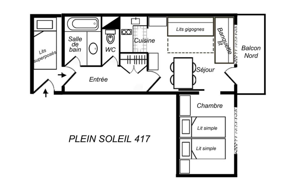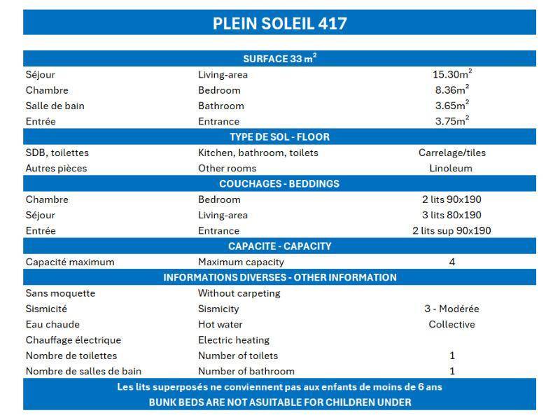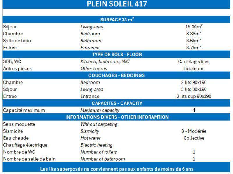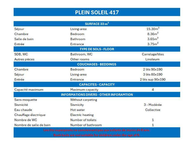 Die Residenz Plein Soleil mit Aufzug liegt ideal in der Nähe von Geschäften, 100 m von der Residenz entfernt. Sie erreichen sie über die Treppe zwischen den Residenzen des Einkaufszentrums von Mottaret. Die nächste Bushaltestelle ist nur 100 m entfernt. Die Residenz bietet zusätzliche Dienstleistungen wie Halbpension im Restaurant Le Grain de Sel und WLAN-Internetzugang. Es gibt auch ein Spielzimmer und eine Rezeption... Fläche von ungefähr 33 m². 1te Etage. Orientierung : Nord. Wohnzimmer mit 2 Einzelbetten. Schlafzimmer mit 2 Einzelbetten. offener Schlafbereich mit 2 Stockbetten. Kochnische mit Kaffeemaschine, Backofen, Toaster, Geschirrspülmaschine, Mikrowellenherd, 2 elektronische Herdplatten, Kühlschrank. Badezimmer. Balkon. Die oberen Betten sind nicht für Kinder unter 6 Jahren geeignet.
