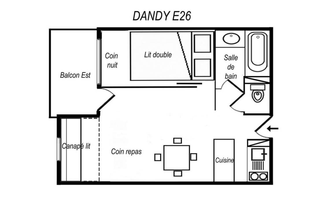 Die Residenz Dandy liegt ideal neben den Geschäften. Alle Dienstleistungen und Aktivitäten befinden sich in der Nähe der Residenz. Fläche von ungefähr 27 m². 3te Etage. Orientierung : West. Wohnzimmer mit Klappschlafcouch. Schlafbereich mit Doppelbett, schiebetüren. Kochnische mit Wasserkocher, Kaffeemaschine (filtre), kleiner Backofen mit Mikrowellenfunktion, Toaster, Dunstabzugshaube, Geschirrspülmaschine, 2 Glaskeramikkochfelder, Kühlschrank. Badezimmer mit Badewanne. separates WC. Balkon.