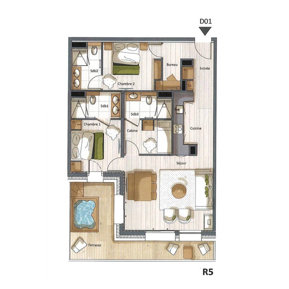 Fläche von ungefähr 85 m². Erdgeschoss. Orientierung : West. Blick berg. Wohnzimmer mit Ethanol-Kamin. 2 Schlafzimmer mit Doppelbett, , Haartrockner, Handtuchtrockner, WC. offener Schlafbereich mit 2 Stockbetten, , Haartrockner, Handtuchtrockner, WC. Küche mit Wasserkocher, Kaffeemaschine, Backofen, Toaster, Dunstabzugshaube, Waschmaschine, Geschirrspülmaschine, Herdplatten, , Kühlschrank. Terrasse mit Whirlpool. Büro. Die oberen Betten sind nicht für Kinder unter 6 Jahren geeignet.