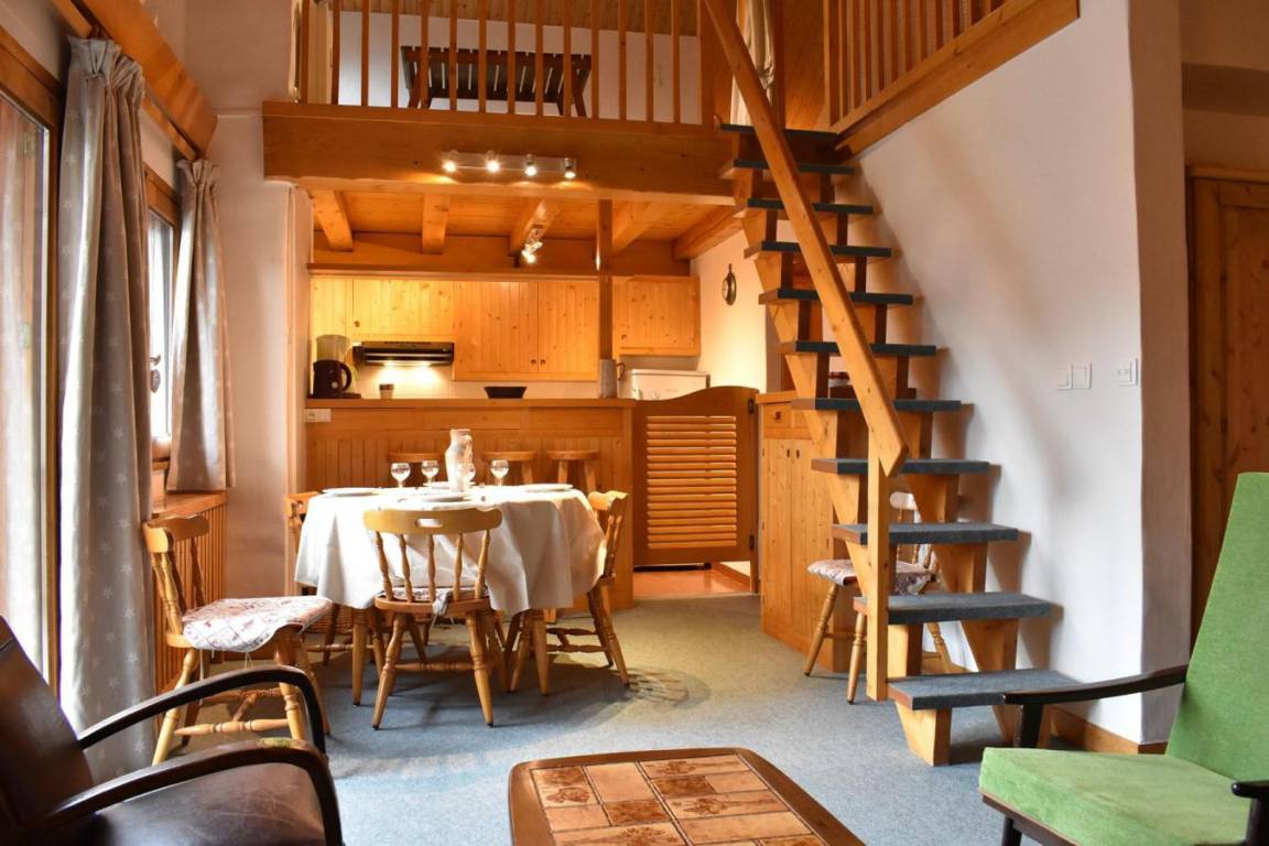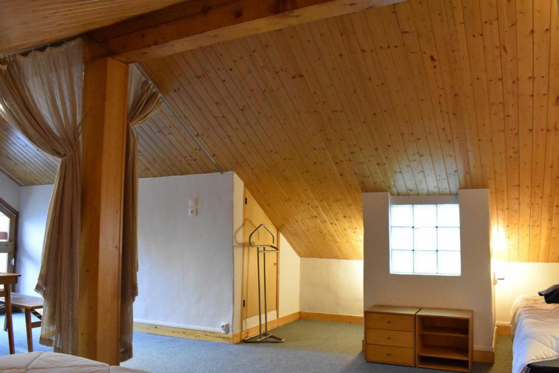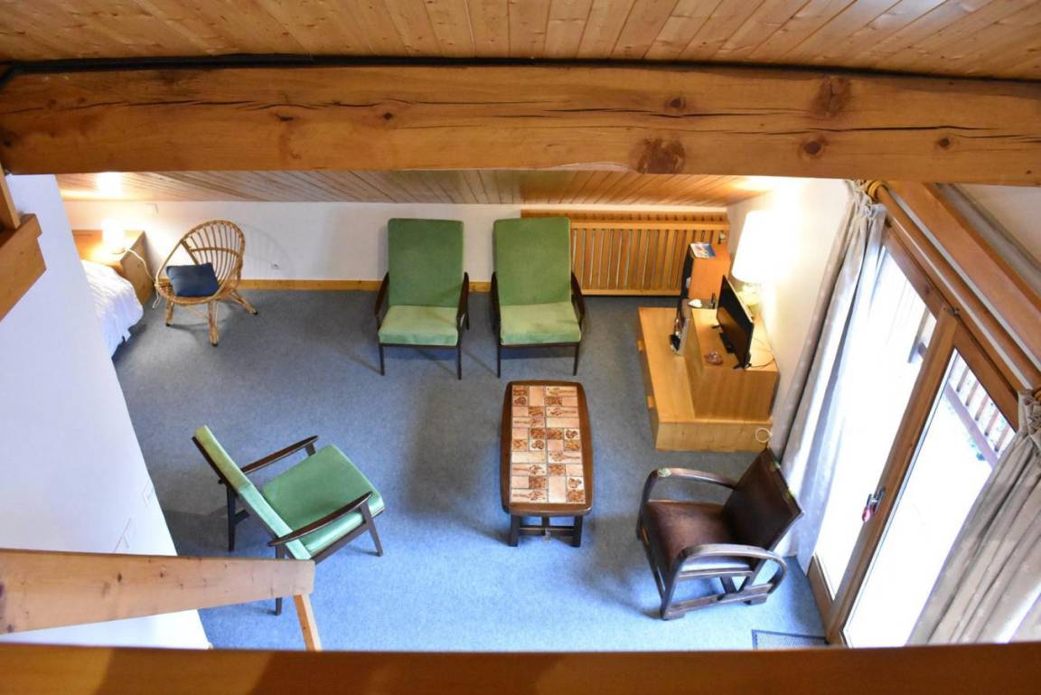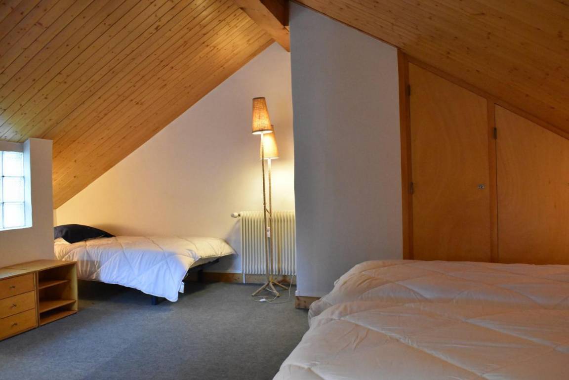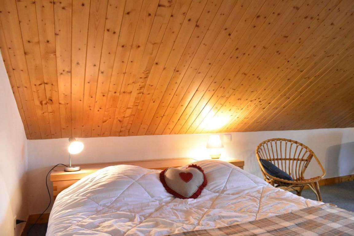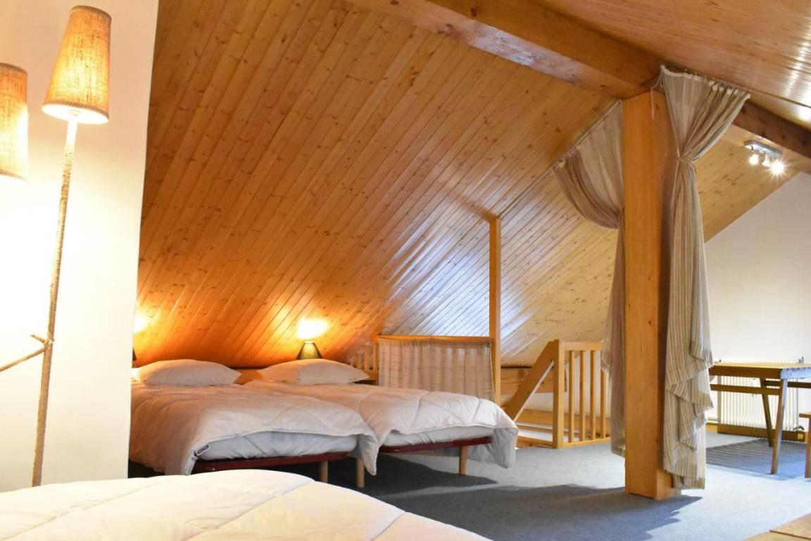 Fläche von ungefähr 60 m². 4te Etage. Orientierung : West. Niveau 0 : Wohnzimmer mit Doppelbett (160). Kochnische mit kleiner Backofen mit Mikrowellenfunktion, Geschirrspülmaschine, Induktionsherdplatten, Kühl-Gefrier-Kombination. Badezimmer mit Waschmaschine, Wäschetrockner, WC. Balkon. Niveau 1 : Zwischengeschoss mit 3 Einzelbetten (80).