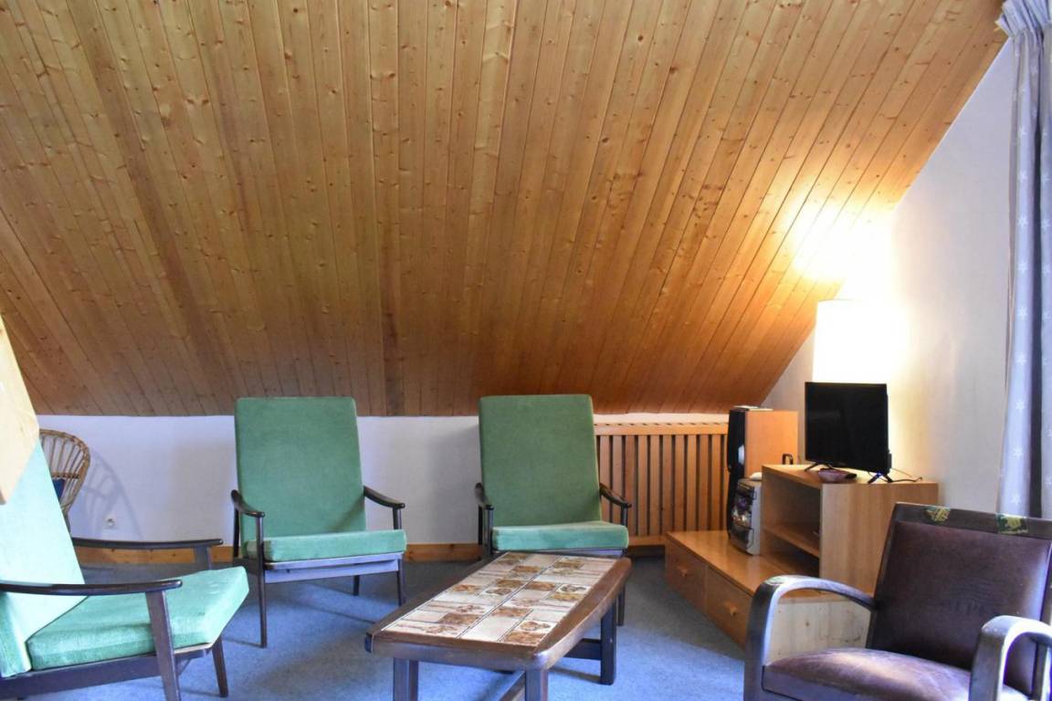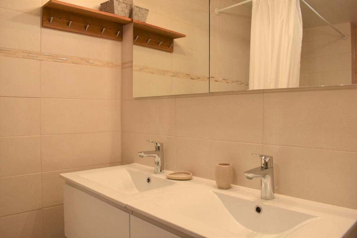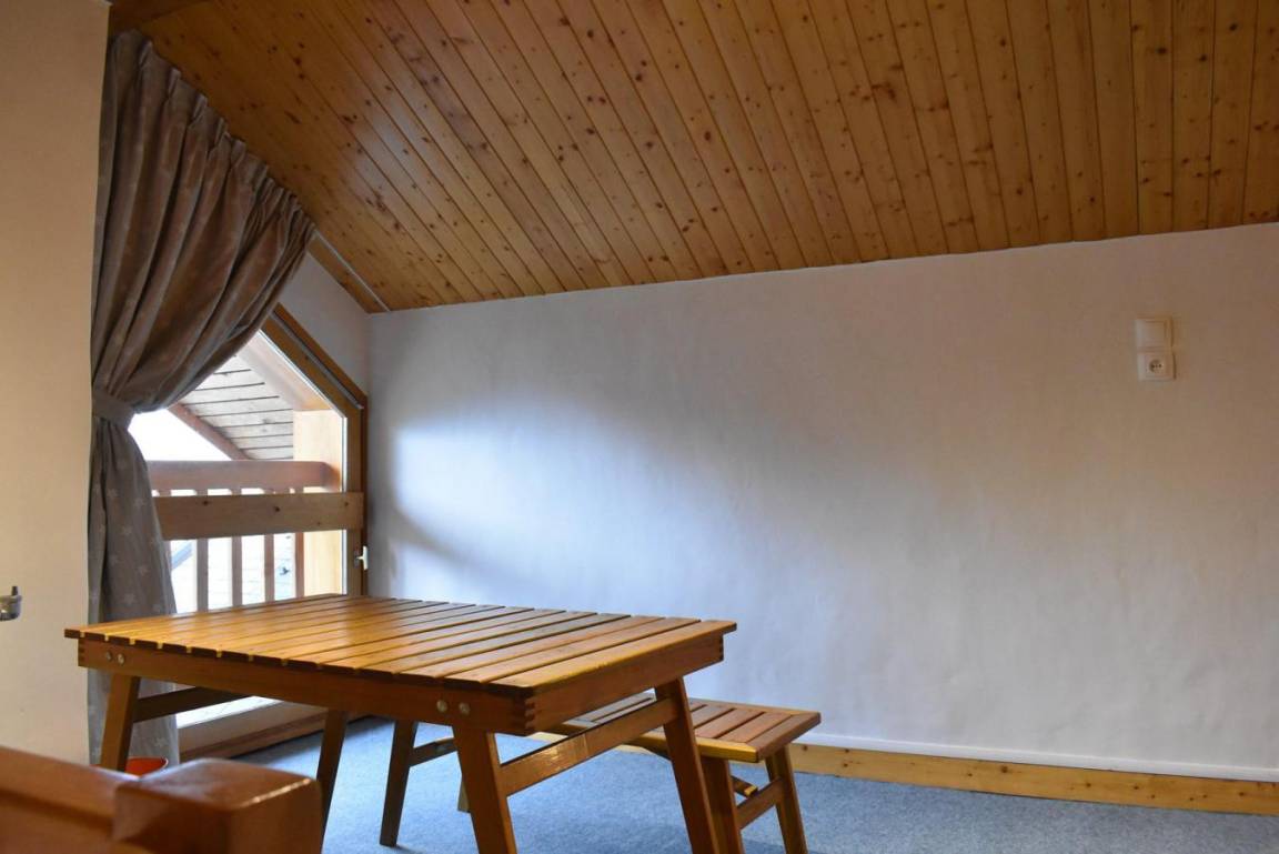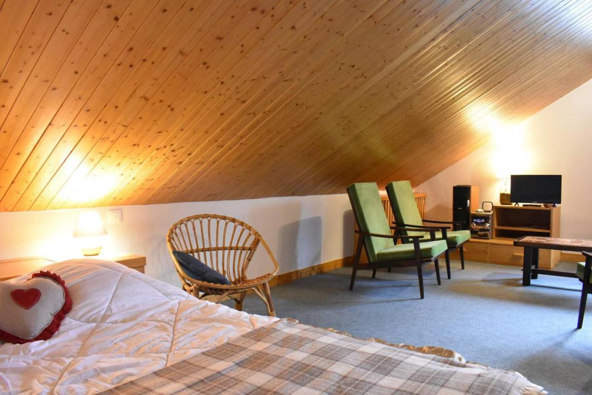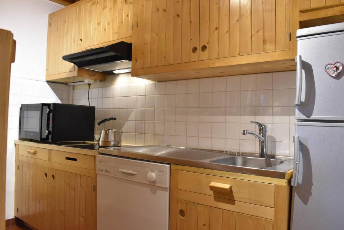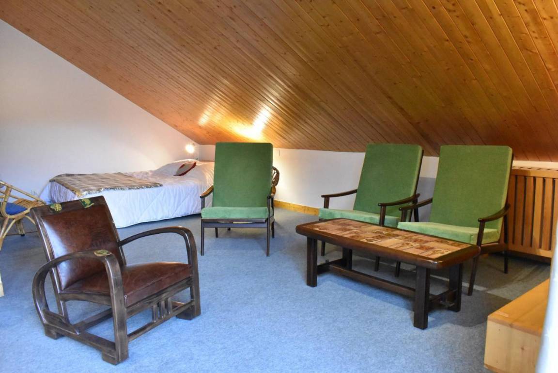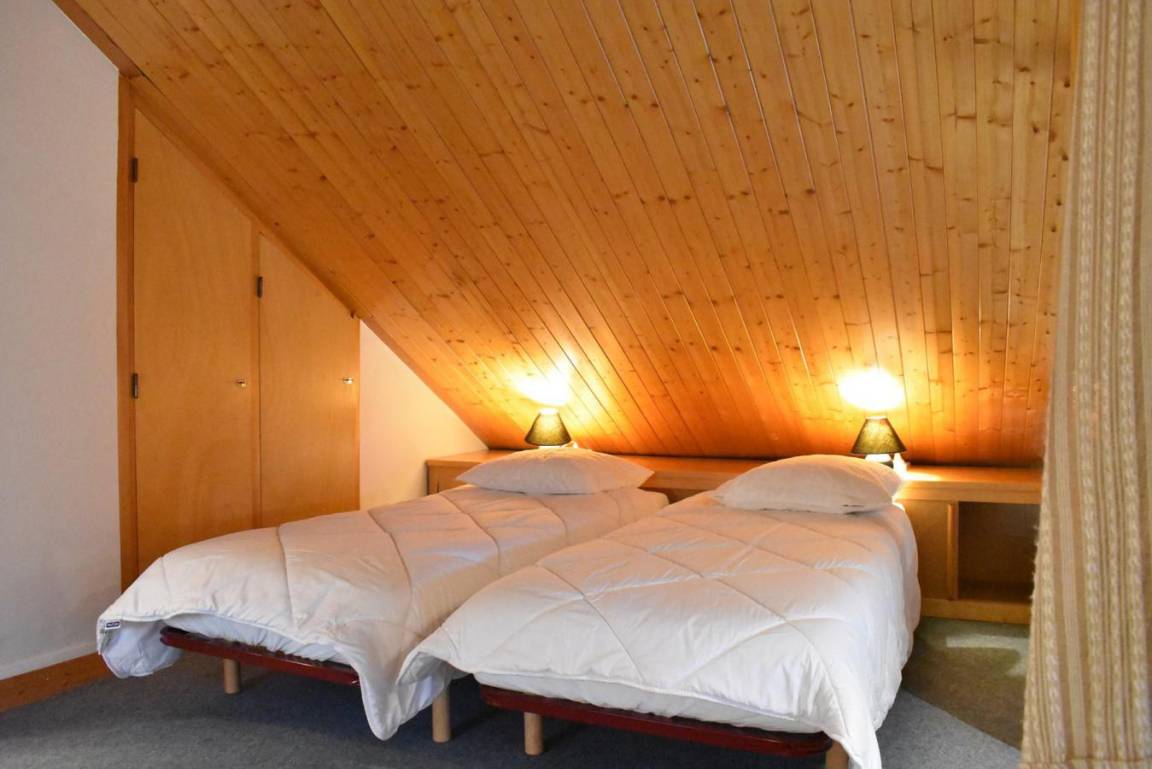 Fläche von ungefähr 60 m². 4te Etage. Orientierung : West. Niveau 0 : Wohnzimmer mit Doppelbett (160). Kochnische mit kleiner Backofen mit Mikrowellenfunktion, Geschirrspülmaschine, Induktionsherdplatten, Kühl-Gefrier-Kombination. Badezimmer mit Waschmaschine, Wäschetrockner, WC. Balkon. Niveau 1 : Zwischengeschoss mit 3 Einzelbetten (80).