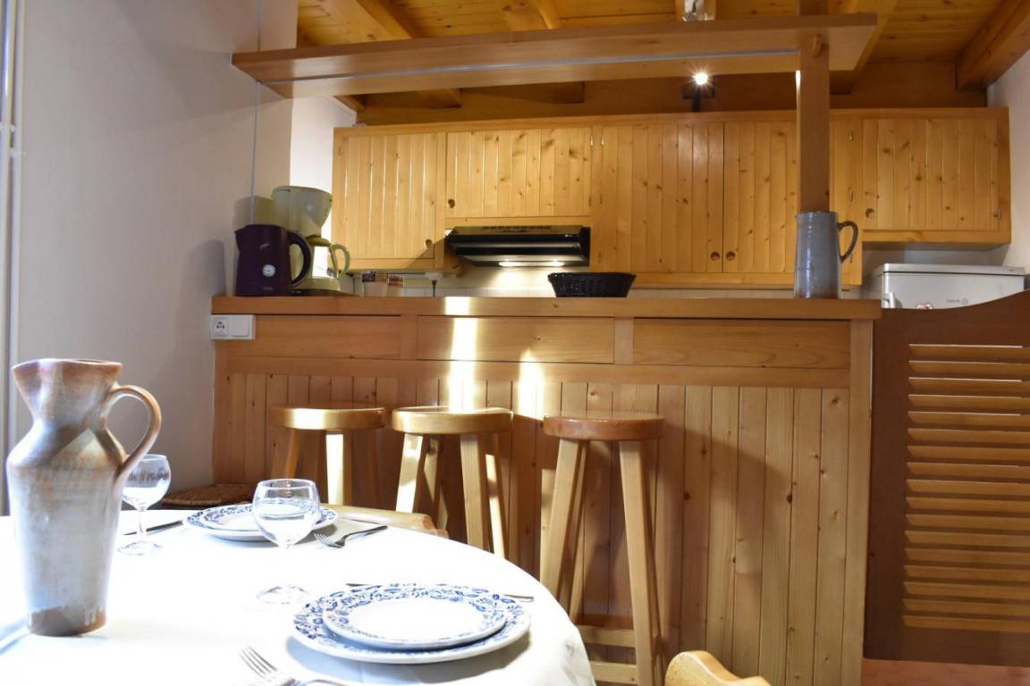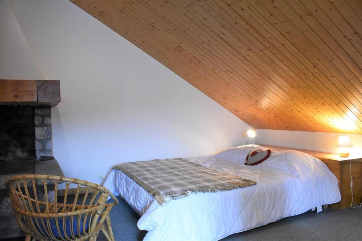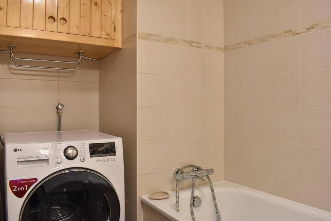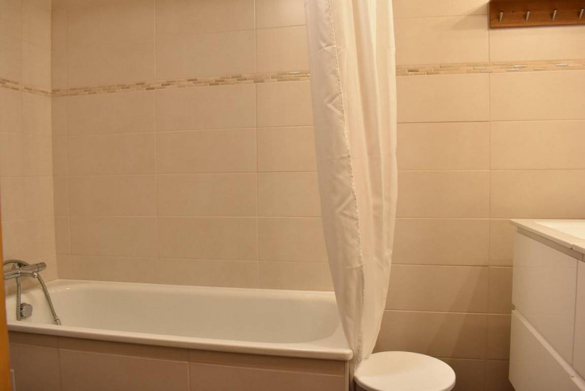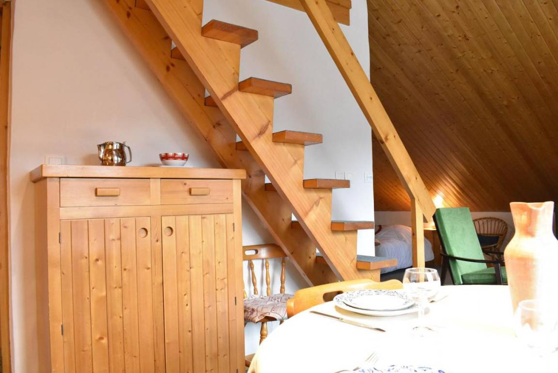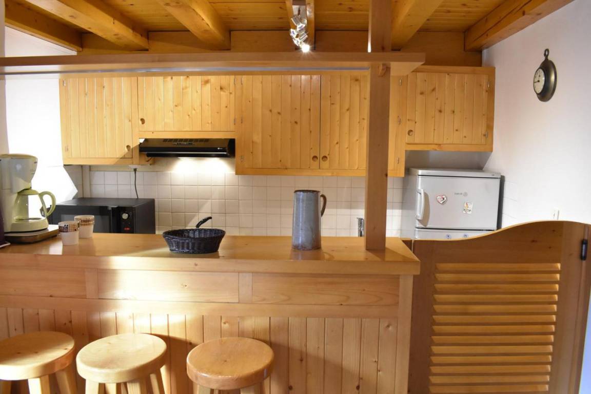 Fläche von ungefähr 60 m². 4te Etage. Orientierung : West. Niveau 0 : Wohnzimmer mit Doppelbett (160). Kochnische mit kleiner Backofen mit Mikrowellenfunktion, Geschirrspülmaschine, Induktionsherdplatten, Kühl-Gefrier-Kombination. Badezimmer mit Waschmaschine, Wäschetrockner, WC. Balkon. Niveau 1 : Zwischengeschoss mit 3 Einzelbetten (80).