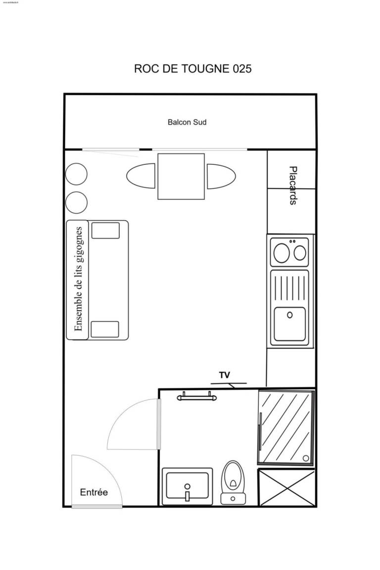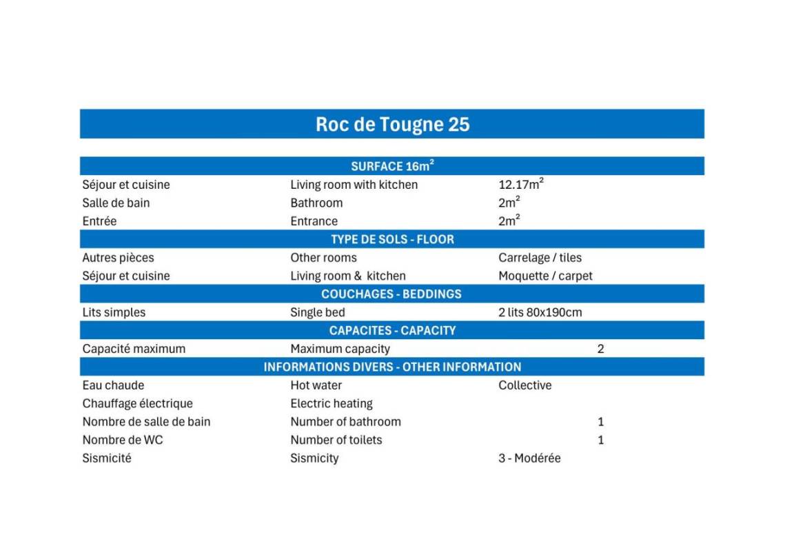 Die Residenz Roc de Tougne ohne Aufzug liegt an den Hängen. Entfernung zu den Geschäften: 100 m über die Treppe, die Residenz liegt direkt oberhalb des Geschäftszentrums von Mottaret. Fläche von ungefähr 16 m². Orientierung : Süd. Wohnzimmer mit Ausziehschlafcouch für 2 Personen. Kochnische mit Wasserkocher, Kaffeemaschine (filtre), Toaster, Geschirrspülmaschine, kleiner Backofen, 2 Glaskeramikkochfelder, Kühlschrank. Waschräume mit Dusche, WC. Balkon.