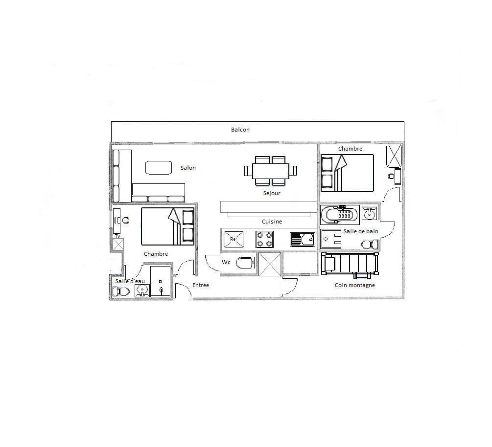 Fläche von ungefähr 70 m². 4te Etage. Orientierung : Süd. Wohnzimmer. Schlafzimmer mit Doppelbett, Waschraum, WC. Schlafzimmer mit Doppelbett. offener Schlafbereich mit 2 Stockbetten. Kochnische mit Backofen, Geschirrspülmaschine, Mikrowellenherd, Glaskeramikkochfelder, Kühlschrank. separates WC. Badezimmer mit Badewanne, Dusche, WC. Balkon. Die oberen Betten sind nicht für Kinder unter 6 Jahren geeignet.