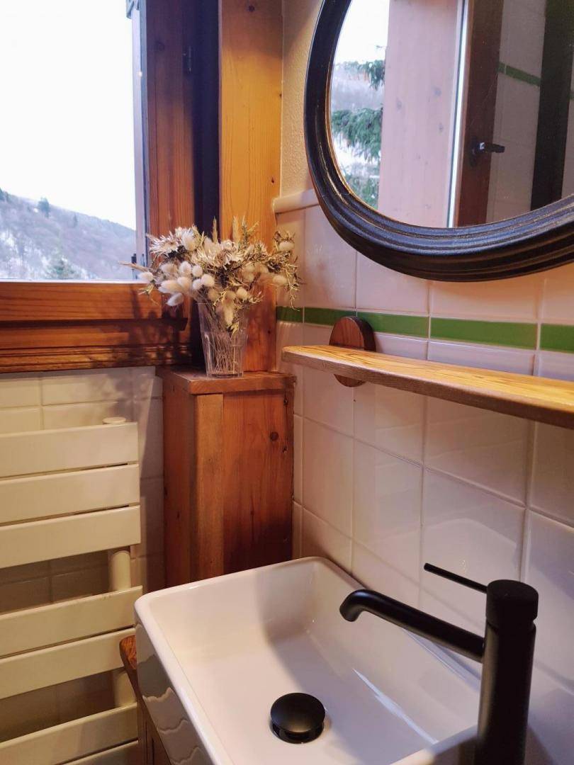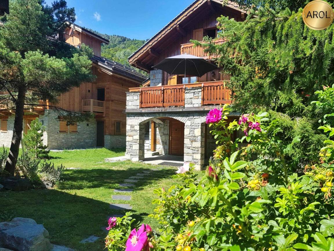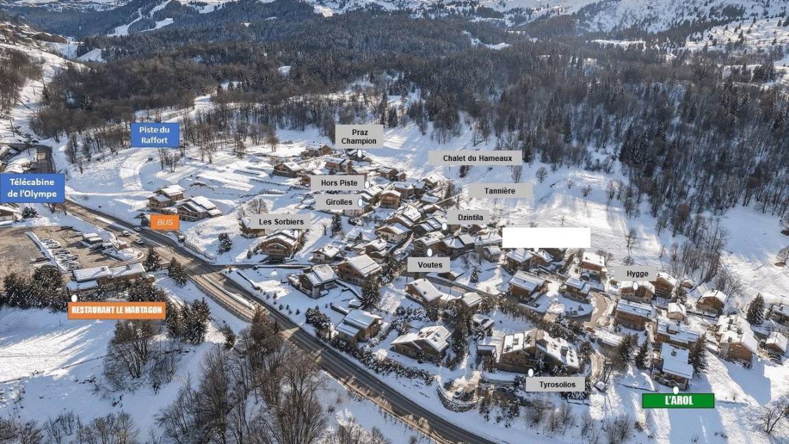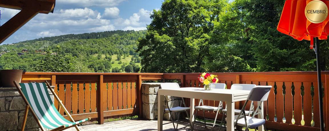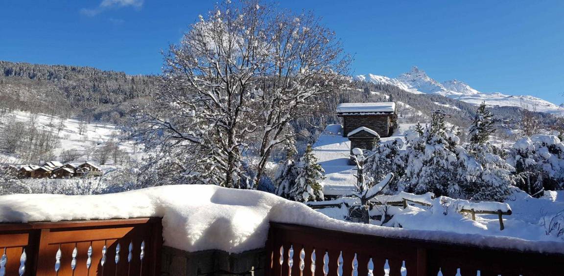 Modernes Chalet, 200 m von der Seilbahn nach Méribel entfernt. Charmantes Wohndörfchen mit Blick auf das Tal. Schöne Umgebung am Waldrand. Guter Komfort. Warmer Bergcharakter. Private Terrasse. Angenehmer gemeinsamer Außenbereich, möbliert und mit Blumen. Schöne freie Sicht auf das Massiv und das Tal.