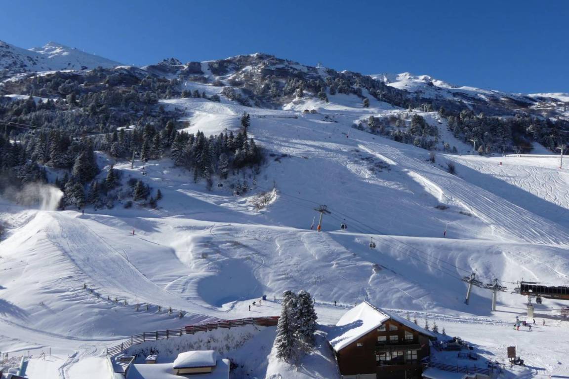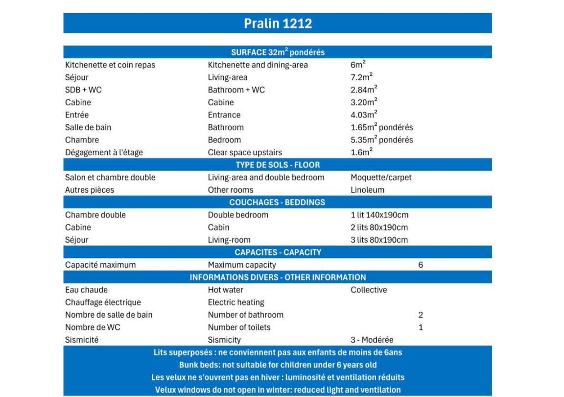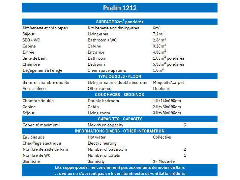 Die Residenz Le Pralin (Les Sentiers de Tueda) liegt ideal oberhalb des Geschäftszentrums von Le Chatelet. Die nächste Bushaltestelle ist nur 100 m entfernt. Das Resortzentrum mit allen Aktivitäten liegt in der Nähe der Residenz. Fläche von ungefähr 32 m². 12te Etage. Orientierung : West. Niveau 0 : Wohnzimmer mit einfache Klappschlafcouch (80*190), 2 Ausziehbetten (80*190). offener Schlafbereich mit 2 Stockbetten. Kochnische mit Wasserkocher, Kaffeemaschine, Mikrowellengrill, Toaster, Geschirrspülmaschine, 4 Glaskeramikkochfelder, Kühlschrank. Waschräume mit Dusche, WC. Balkon. Niveau 1 : Schlafzimmer mit Doppelbett. Badezimmer mit Badewanne. Die oberen Betten sind nicht für Kinder unter 6 Jahren geeignet.